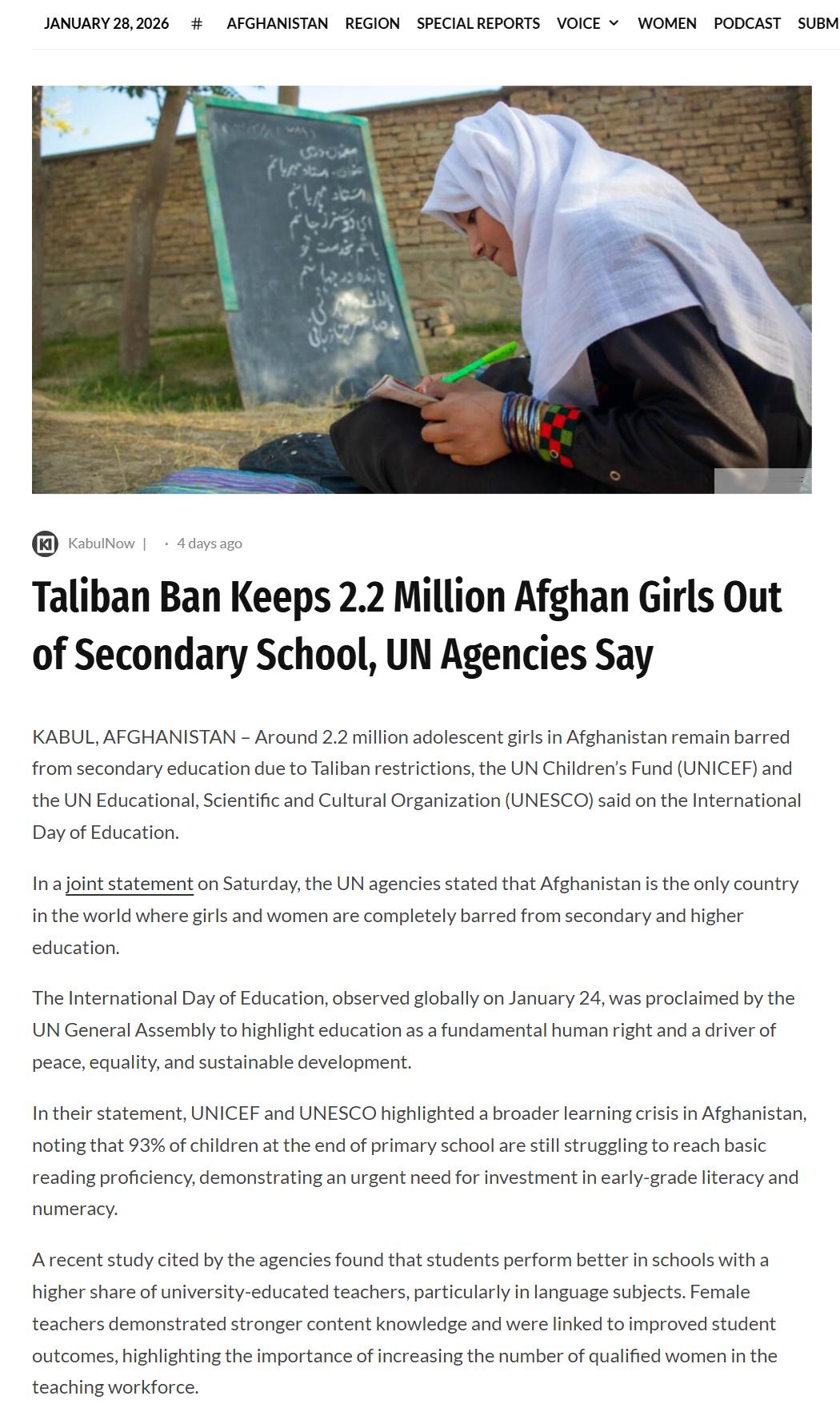 🔻细说一下阿富汗这事儿。🔻首先,截至当前(2026年1月28日),没有主流国际媒体报道确认在2026年1月26日有“阿富汗塔利班教育部长纳迪姆正式宣布将女性教育禁令升级为永久性政策”的具体新事件。🔻我检索了主要的西方/国际英文信源(如路透社、BBC、美联社、《纽约时报》及联合国/联合国教科文组织/联合国儿童基金会 2026 年 1 月的声明),都没有证实这几天阿富汗发布过全新的“永久性禁止女性教育”的公告。🔻不过,在“国际教育日”(1月24日)当天,联合国儿童基金会与联合国教科文组织表示,受塔利班政策限制,约 220 万阿富汗少女仍被禁止接受中等教育。🔻自 2021 年 8 月重新掌权后不久,塔利班便禁止女性接受中学教育,随后又将禁令延伸至高等教育、就业等领域,时间线大致是这样:🔹2021年8月15日:塔利班重新控制喀布尔,接管阿富汗政府。初期承诺“温和”统治,包括尊重女性权利和教育。🔹2021年9月:新学年开始时,仅允许男孩返回中学,女孩中学(七年级以上,约12岁起)被禁止,小学女孩仍可上学,但出席率下降。🔹2022年3月:原计划重开女孩中学,但塔利班宣布“临时”无限期推迟,称需确保符合“原则和阿富汗文化”(如性别隔离等)。🔹2022年12月20日:塔利班高等教育部宣布禁止女性进入所有公立和私立大学(包括已注册的学生)。这进一步扩展禁令至高等教育,影响数万女性。🔹2023-2024年:禁令持续,无任何重开迹象。塔利班逐步扩大限制,包括禁止女性在NGO工作(2022年底)、公共场所(如公园)、医疗培训等领域。联合国称阿富汗成为全球唯一禁止女孩中学及高等教育的国家,受影响女孩约140-220万(视数据来源不同而数字有差别)。🔹2025-2026年:禁令已持续超过4年(中学禁令超1500天,大学禁令超1100天)。🔻尽管过去四年来联合国、援助组织、人权机构及部分伊斯兰国家多次呼吁,塔利班仍拒绝撤销禁令,坚称这是其内政事务。🔻从另一个角度看:阿富汗经济高度依赖农业、畜牧业和非正规经济,工业基础极度薄弱(制造业占比GDP不到10%,缺乏大规模工厂、现代企业)。正规就业机会有限,尤其对女性。🔻2001-2021年间,在国际援助和前政府推动下,阿富汗教育体系大幅扩张,女孩入学率从近零升至80%以上,女性识字率翻倍,许多学校引入艺术、文学、人权、性别平等、西方哲学、社会科学等课程。🔻这些专业的学生,在现在的阿富汗几乎没办法找到对口专业的工作。🔻在塔利班内部确实有这样一种看法:国家没有足够“现代工作”(如工厂、办公室、科技岗位),女性上学后“找不到工作”,反而可能导致社会不满或“闲置”。教育应服务于“实用”目的(如宗教学习、家务、有限的医疗/教学),而非追求“无用”的高等教育。🔻所以塔利班的一些做法也间接体现类似逻辑:他们允许少数女性在医疗、初等教育等领域工作(因为这些被视为“必要”且性别隔离可行),但禁止大多数其他职业。这暗示他们认为超出“基本需求”的教育对女性“无益”或“多余”。🔻又例如:阿富汗允许女性参加一些手工学校、裁缝培训中心或类似项目。这些往往由NGO(如UNICEF、CARE)、地方组织或社区运作,许多针对被剥夺正规教育机会的女孩和妇女,提供缝纫、地毯编织、刺绣等技能培训,帮助她们在家工作或自力更生。🔻2025年有报道显示UNICEF与合作伙伴在赫拉特省为200名女孩提供缝纫和地毯编织培训。喀布尔等地有女性职业培训中心(如CARE支持的Afghan Women’s Vocational Training Center),教授缝纫、手工艺和食品加工。一些报道提到塔利班当局批准了约100个女性培训中心,专注于裁缝、刺绣和手工艺等“合适”的技能培训。许多女孩因学校关闭而转向这些缝纫作坊或车间学习,课程时长从3个月到9个月不等。🔻所以,阿富汗女性可以参加某些手工/裁缝学校或职业教育项目,尤其是非正式的技能培训,作为正规教育被剥夺后的“替代路径”,多多少少也能缓解一些就业困境。🔻不过,塔利班官方核心理由还是基于宗教的,塔利班高层(如高等教育部长Neda Mohammad Nadim)公开称,女性教育需严格遵守“教法标准”与普什图瓦里传统,包括避免男女混校、着装违规等,青春期女孩不应外出求学,以防“道德腐败”。在塔利班内部,很有一拨保守派视前20年教育为“美国强加”的产物,旨在逆转这些变化,认为女性主要角色是家庭而非公共领域,希望重建“纯正社会秩序”。部分温和派(如外交部副部长)曾私下或公开呼吁取消禁令,但未能改变现政策。🔻现状就是,塔利班官方始终以纯洁性为首要理由,从未公开承认“没工作所以不让上学”,这一政策已导致阿富汗成为全球唯一禁止女孩中学及高等教育的国家,影响220万+女孩,长期将造成医生、教师短缺、经济损失,而塔利班的禁令也确实强化了阿富汗的经济落后与性别隔离循环:没有工业→就业有限→教育“无用”→进一步限制女性教育→经济更难发展。🔻这也是光靠很多人在网络上对着现在的阿富汗喊口号而无法解决的问题。阿富汗永久禁止女性上学海外新鲜事热点现场