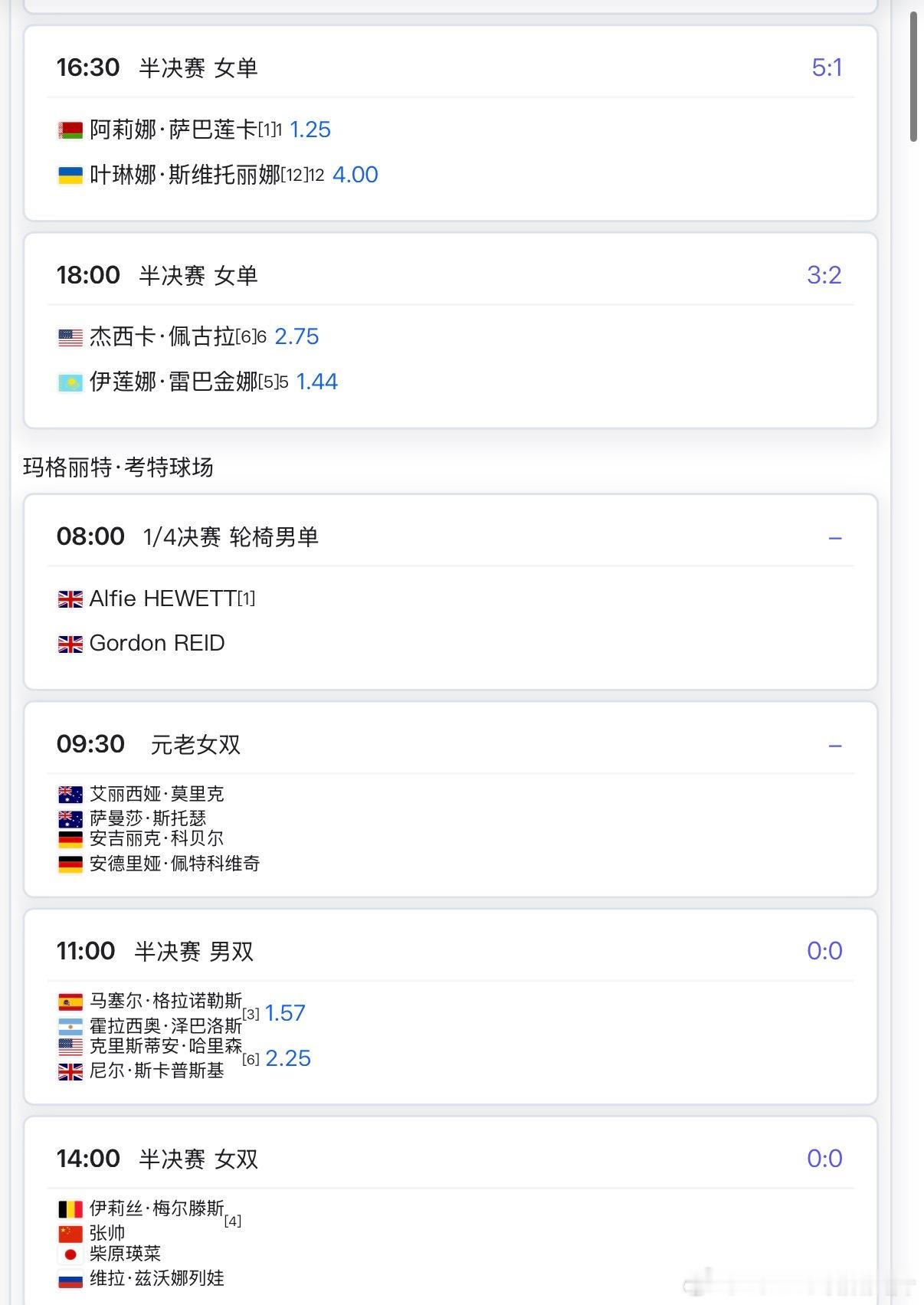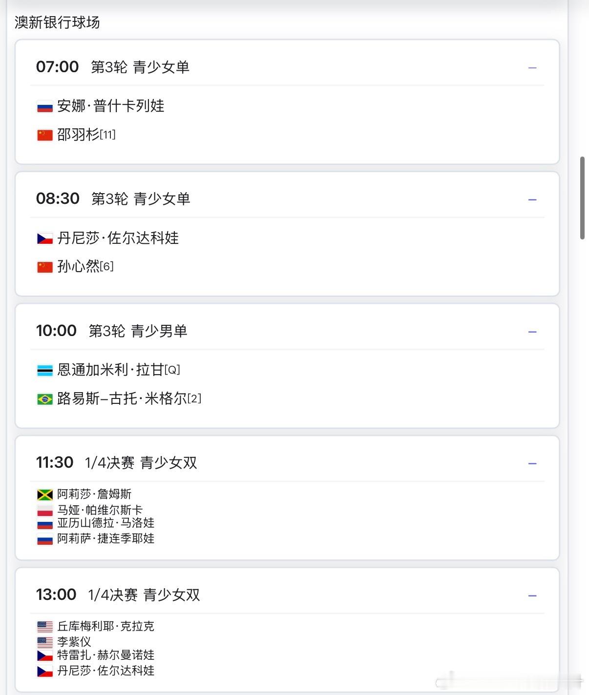 澳网2026 1月29日焦点赛程07:00 【11】🇨🇳邵羽杉vs🇷🇺普什卡列娃08:00 【6】🇨🇳孙心然vs🇨🇿佐尔达科娃14:00【4】🇨🇳张帅/🇧🇪梅尔滕斯vs🇷🇺兹沃娜列娃/🇯🇵柴源瑛菜 🔥16:30【1】🇧🇾萨巴伦卡 vs 【12】🇺🇦斯维托丽娜18:00【5】🇰🇿莱巴金娜 vs 【6】🇺🇸佩古拉对了,WTA125女单1/4决赛15:30 🇨🇳朱琳vs🇭🇷维基奇也会一起关注🥰中国网球