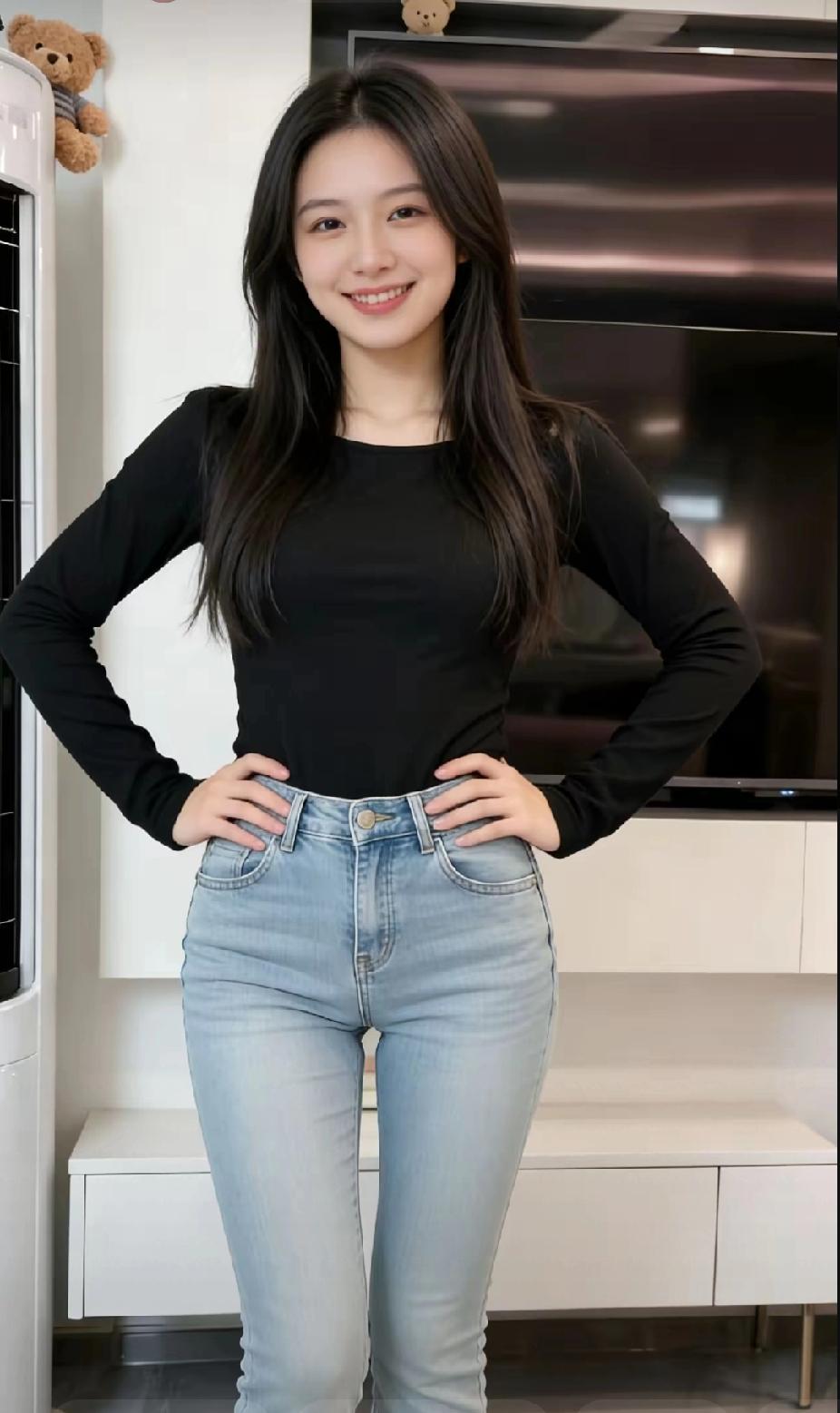 简约穿搭,黑色上衣配牛仔裤,清新自然!