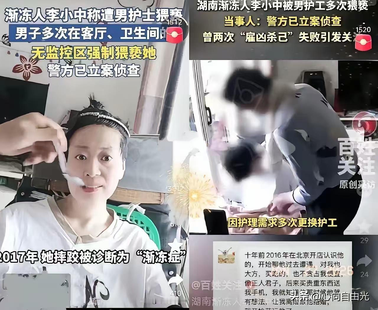 女病人找个男护工且住到男的家里去,男的自愿护理一个患渐冻症的女人,百思不得其解,只能说世界之大。 自己选个男护工,本身就是问题。洗澡,擦屁股,不知道要不要身体接触。 女的可能对家人愤怒,出走以示反抗,但是她高估了家人,家人希望她消失。她对男护工举报,或许是对世界的绝望,看了会不久于人世了。 渐冻人不能动,擦屎擦尿洗澡,男护工怎么做? 前后不矛盾吗,她自己生活不能自理翻身都做不到,那她的大小便怎么解决不还是这个男护工吗包括洗澡。 自己都不会动了,是谁把这些事情发到网上的? 身体瘫痪,但大脑并不瘫痪,要知道感恩,身体的清理全靠那男护工,别做山中狼。 别博眼球了,此男人是这女的前男友,这女的道德败坏有老公还跑去和人同居。