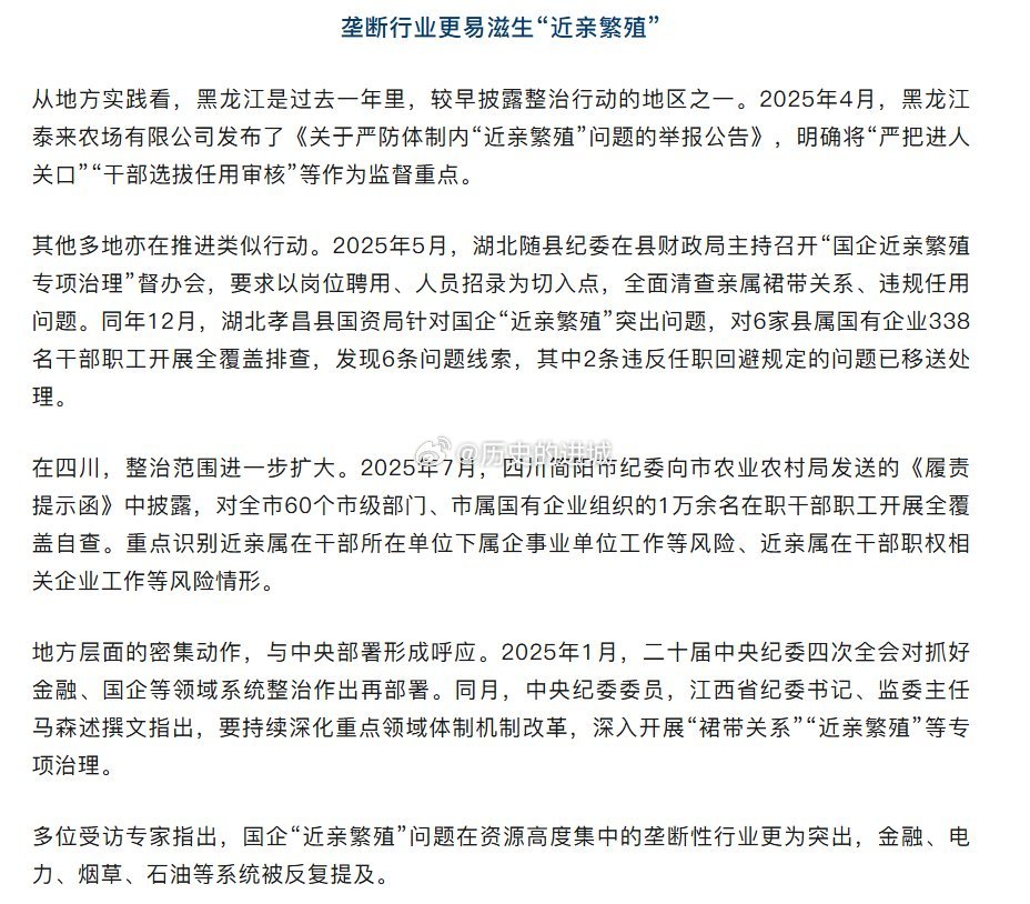 据中国新闻周刊报道,过去一段时间,多个省份发起针对国企“近亲繁殖”的整治行动。国企“近亲繁殖”问题在资源高度集中的垄断性行业更为突出,金融、电力、烟草、石油等系统被反复提及。
