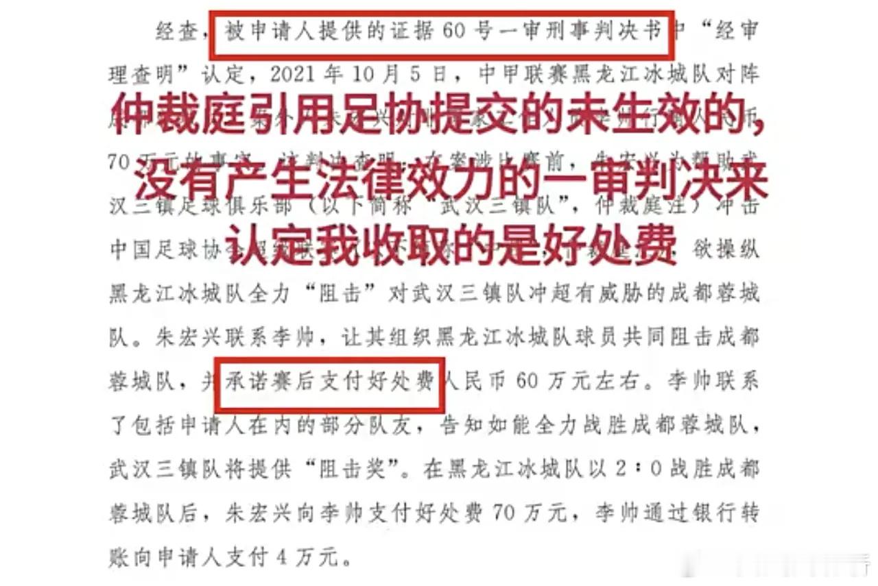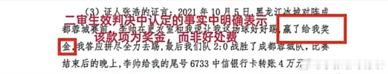 收了李帅4万元!31岁后卫被禁足1年后抗议足协:全力踢球也有错?今日,前广东广州豹的后卫球员张浩在社媒发文,控诉中国足协1年前对他的禁足处罚。张浩表示足协恶意给他添加罪名,并晒出了部分证据,引起了外界的热议。张浩今年31岁,他曾效力过上海申鑫、黑龙江冰城、广东广州豹等队。2024年9月,中国足协宣布张浩被禁足5年,具体禁足时间为2024年9月10日至2029年9月9日。在遭到禁足令后,张浩被解约。张浩目前的社媒简介为“二十多年的付出和坚持被轻描淡写冤枉禁赛,这口气你让我怎么咽下?”在得知足协明日将召开相关发布会后,张浩今日发文:“明天的发布会不管是针对个人的处罚,还是针对俱乐部的处罚,对我都是不公平的,也是对我的再一次伤害,我已经委托律师让他摘取一些仲裁庭上足协代表恶意给我扣罪名的一些证据。”随后,张浩发了第一份证据--仲裁开庭的笔录。在这份笔录中,足协认为张浩在收钱后踢得比正常情况下要更拼。对此,张浩如今表示:“这个证据是足协在仲裁庭上恶意把踢假球的罪名强压在我头上的证据。大白话就是他认为我努力的踢比赛,所以操纵了比赛。他认为在无关紧要的比赛当中,运动员不需要全力的去踢比赛。”有网友在留言区对他提出质疑。紧接着,张浩就晒出了第二份证据(裁决书)。张浩指出,“裁决书能看出来,仲裁庭引用足协提交的未生效的、没有产生法律效力的一审判决书来认定我收取的是好处费。”“二审有效判决中,认定的事实中明确表示,该款项为奖金,而非好处费。”网友对此反问:“就说关键的,有没有收钱吧。”针对网友的这个问题,我们从判决书能看到--张浩确实收钱了。2021年10月,中甲赛场,黑龙江冰城对阵成都蓉城。蓉城和武汉三镇都有中超的可能。赛前,朱宏兴联系李帅,让其组织黑龙江冰城队球员共同阻击成都蓉城队,并承诺赛后支付好处费人民币60万元左右,李帅联系了包括张浩在内的部分队友,告知如能全力战胜成都蓉城队,武汉三镇队将提供“阻击奖”。在黑龙江冰城队以2:0战胜成都蓉城队后,朱宏兴向李帅支付好处费70万元,李帅通过银行转账向张浩支付4万元。