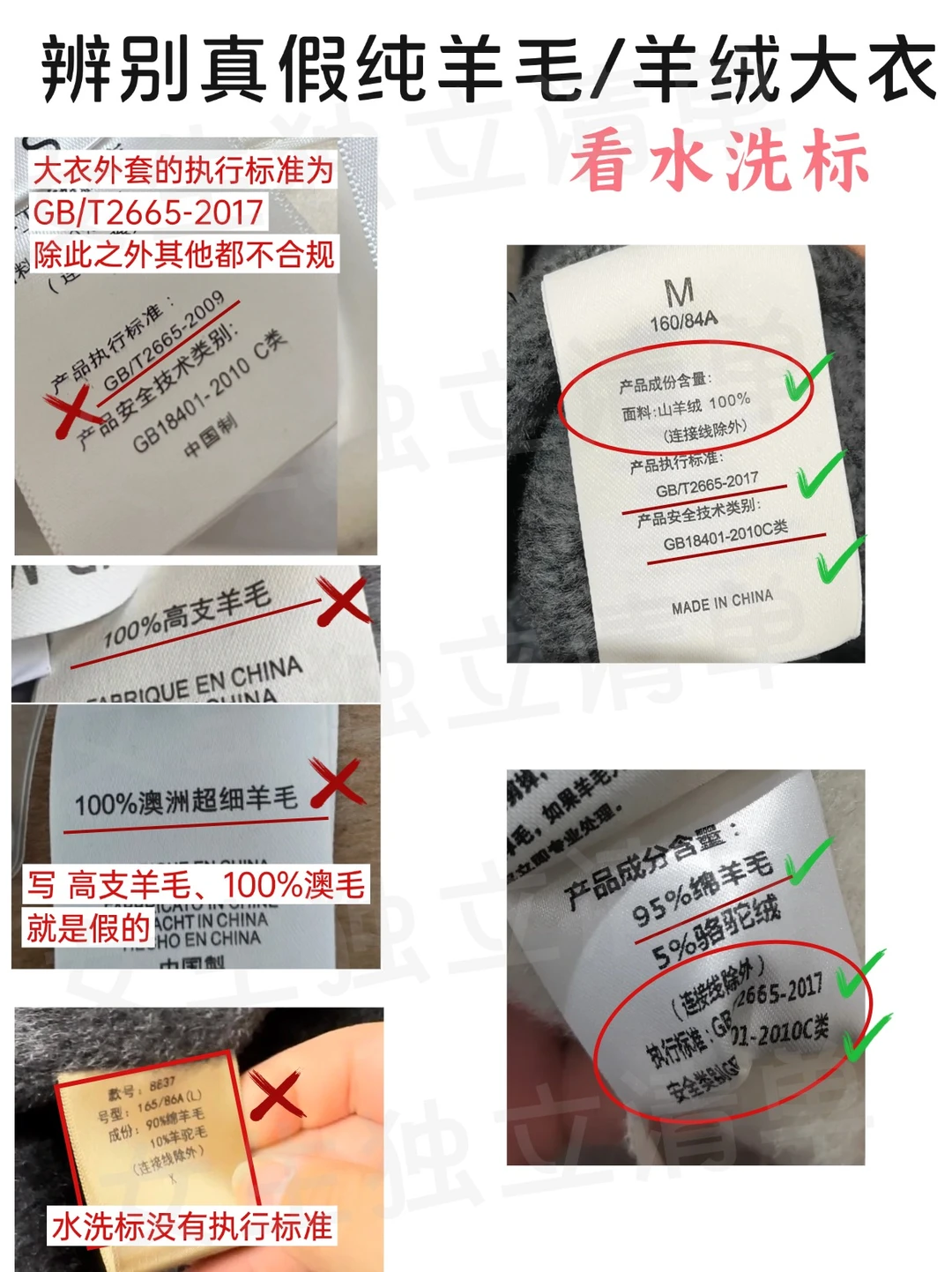 🎈符合规范的水洗标会清楚标注原材料,例如100%羊毛、100%绵羊毛等;⚠️但不会添加产地(澳洲)和粗细指标(高支)等这些词语,如果看到100%澳毛、高支羊毛,都是不合规的,要小心