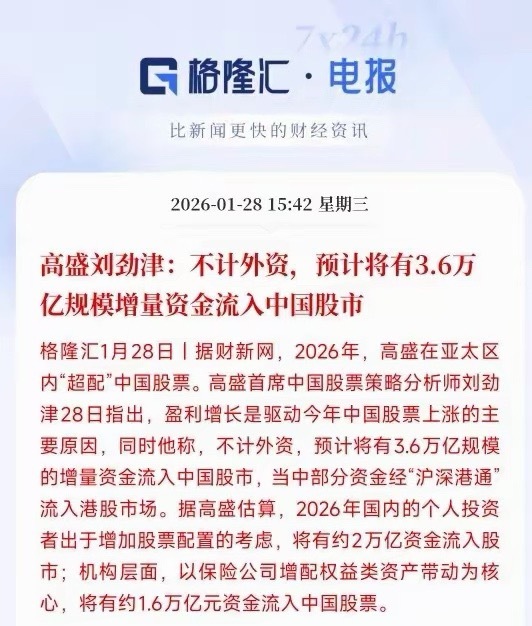 国外大机构预测中国股市还有3.6万亿资金在路上高盛发声:中国资产2026年持续盈利能力吸引资金,预计还有3.6万亿资金将进入股市,而还不算外资的情况下这些资金主要来源来自个人投资者约2万亿与机构投资者约1.6万亿。个人资金主要是居民超额储蓄与定期存款到期(2026年约50-75万亿元定期存款到期),而机构资金-主要就是保险资金和养老金。目前A股正处于结构性牛市当中,如果真有3.6万亿的资金进入中国股市,指数至少还会往上推高,预计5000点是没有问题的。现在就看这些资金什么时候进入股市了,毕竟有一部分是长线资金,很多都会买权重股。