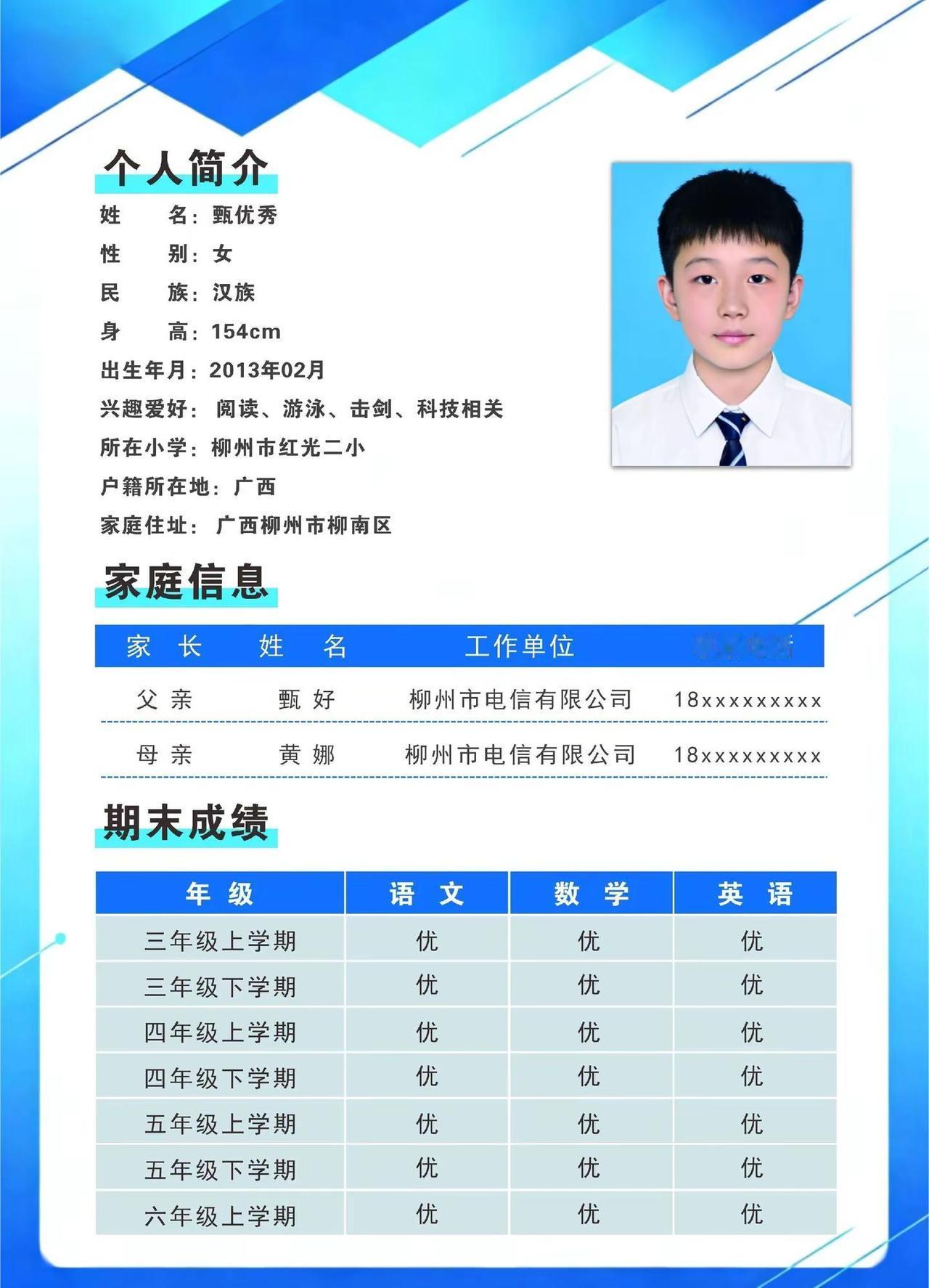 小升初简历,许多城市小学升初中都需要简历,不会做简历的家长可以参考一下