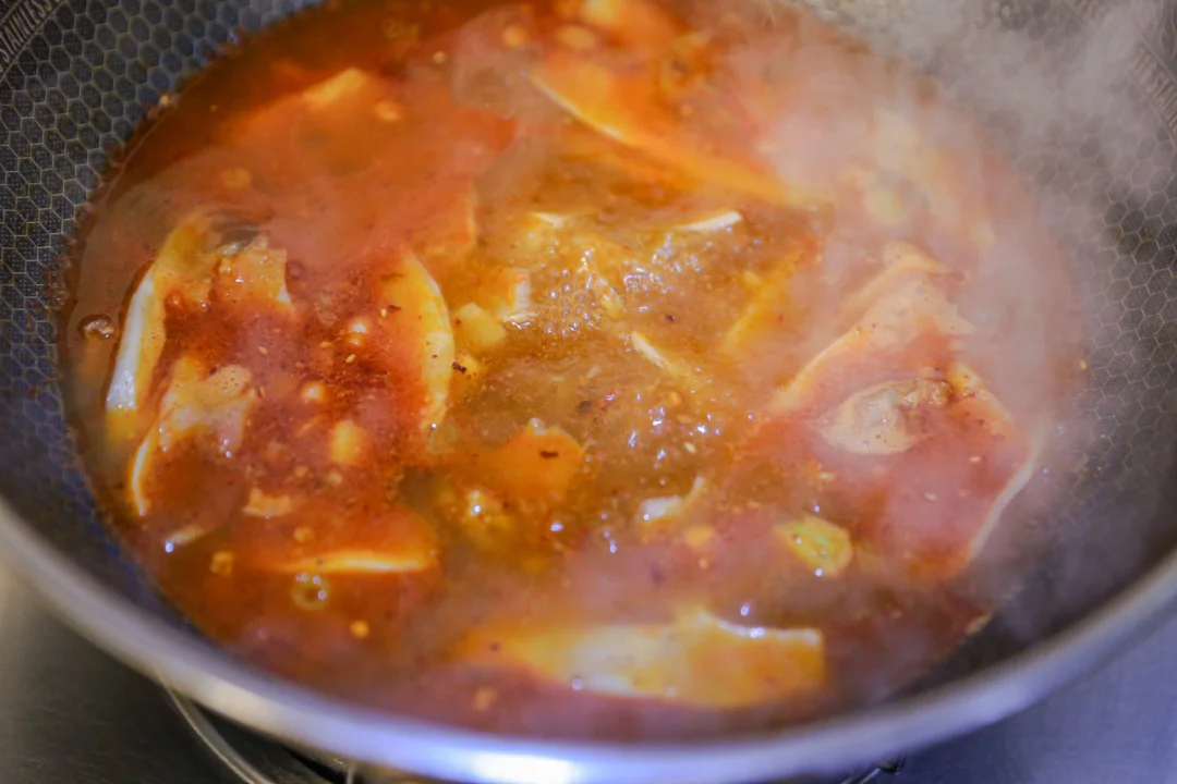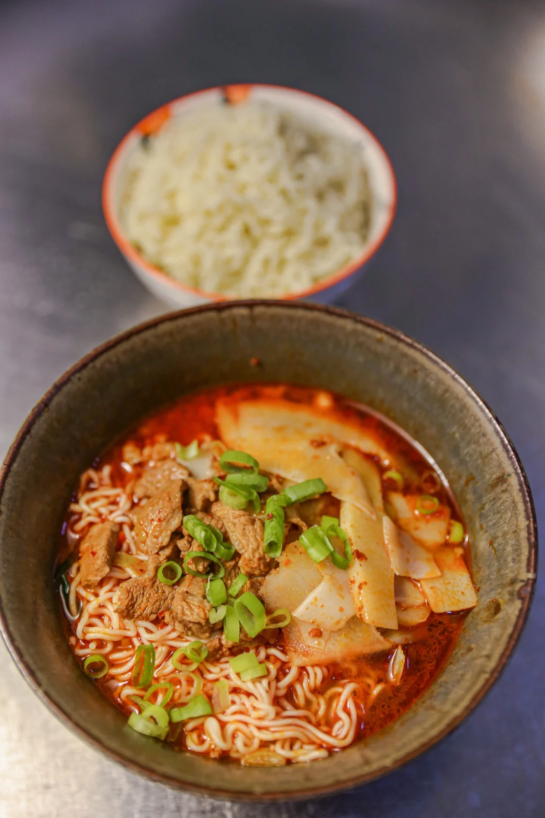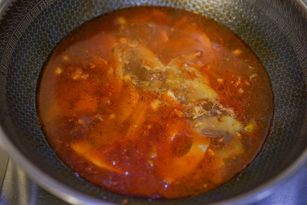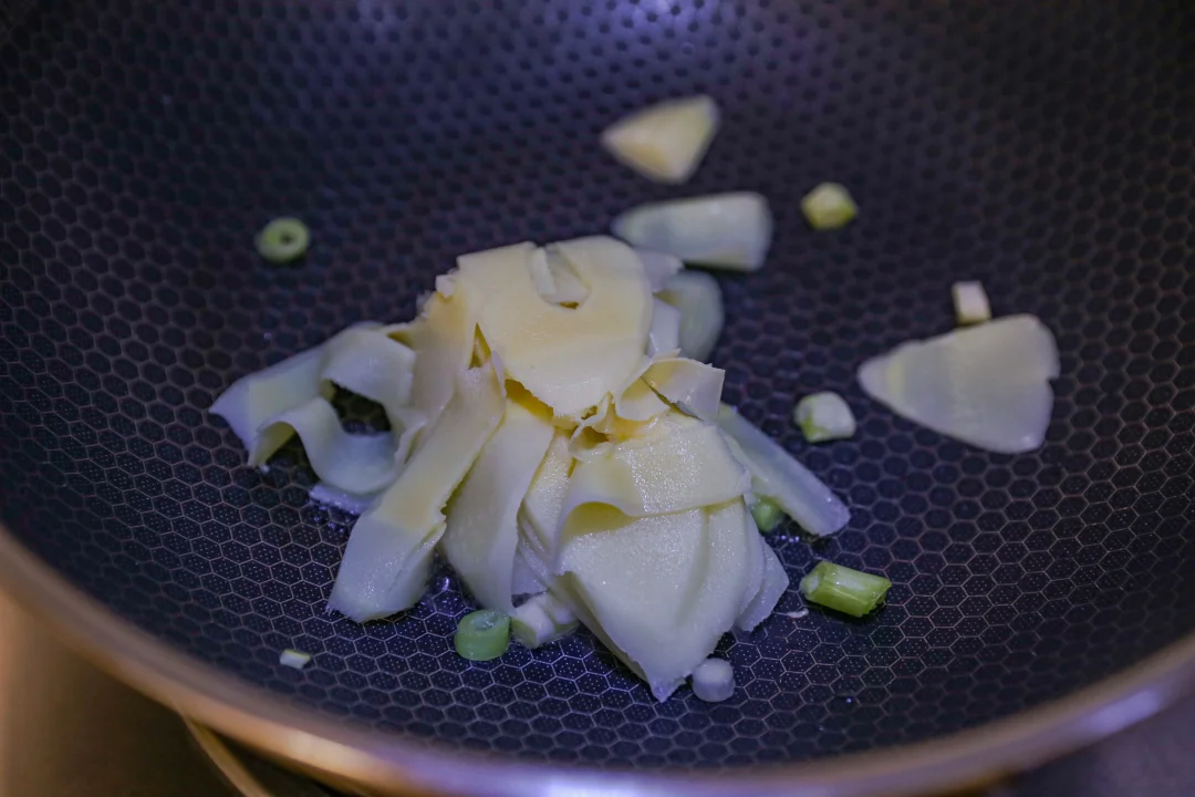 做好肉臊子,炝锅之后加入笋片,加入高汤即可。