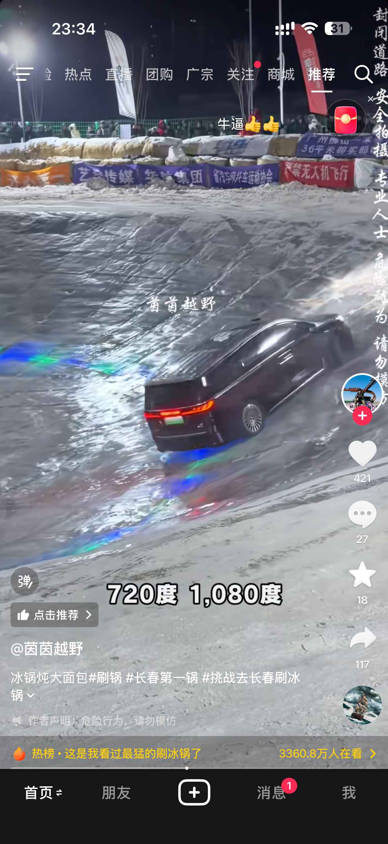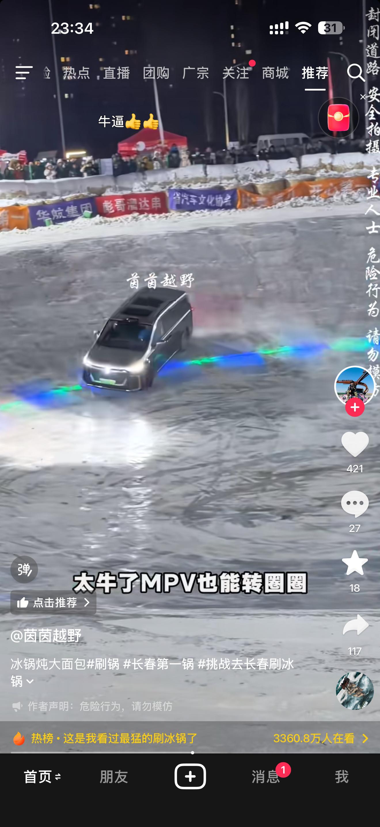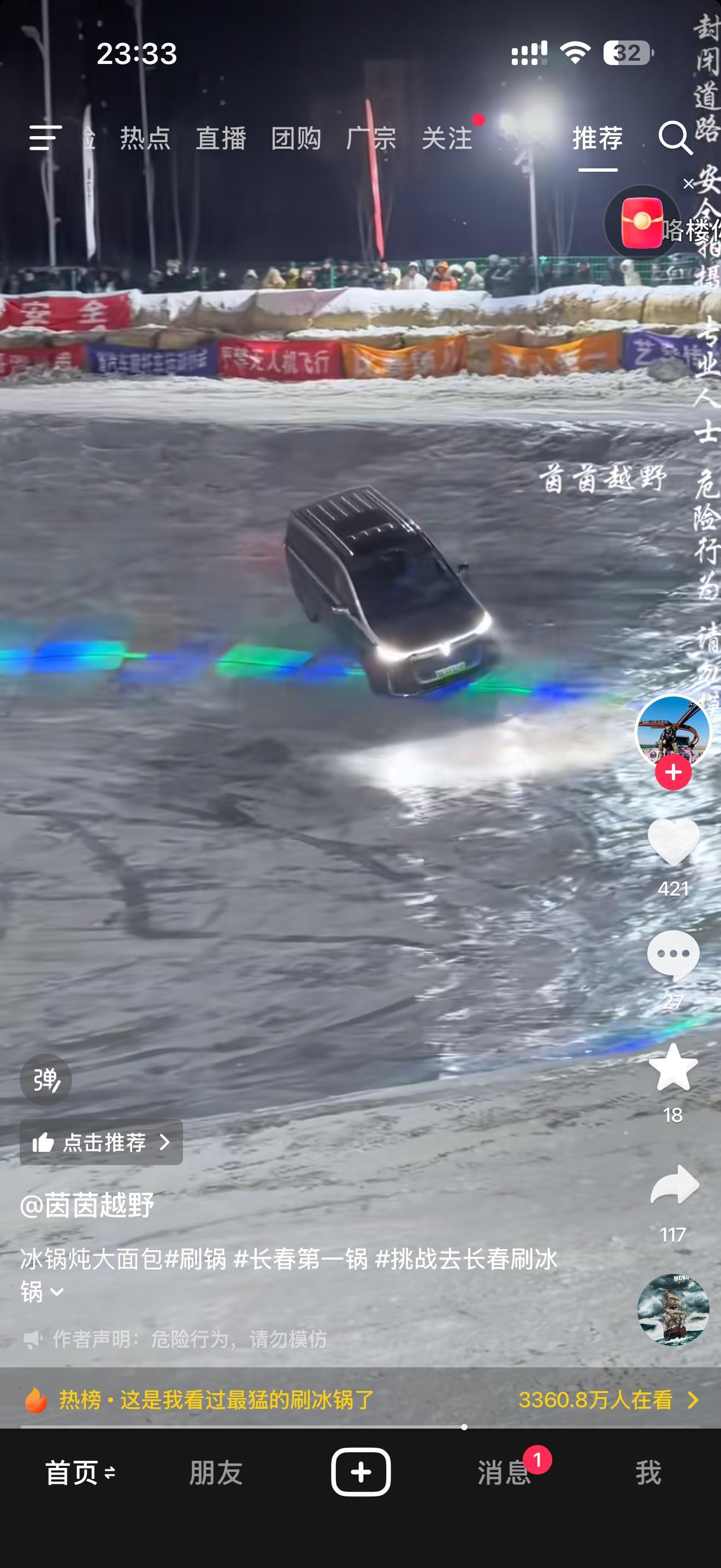 没想到一个大面包子刷冰锅也能转圈圈。不得不说岚图梦想家这个刷冰锅去真的有东西的,驾驶员技术也牛逼,我估计我转一圈就能晕了就是底盘太低,刷锅沿儿容易爆装备大v聊车