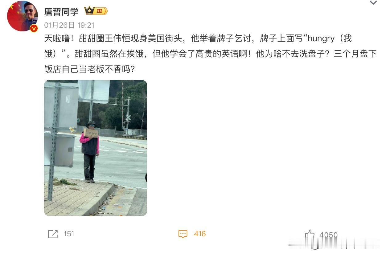 甜甜圈王伟恒疑似沦落街头靠乞讨过日,这下评论区可热闹了!最近关于甜甜圈疑似被拍摄到在街边举牌乞讨果腹的照片火了,该消息迅速冲上热搜。照片上的人带着渔夫帽和墨镜,举着“饥饿”的手写纸板牌。虽然不能直接判断为甜甜圈,但从其脸的下半部分,和神态来看的确有个八九分像是甜甜圈本圈。如果真是他,那么相互矛盾的两个问题来了:1、很多人都说美国不是有免费为流浪汉发放食品的吗,怎么还吃不饱饭?2、美国ICE最近闹得很凶,难道他们对甜甜圈本人会网开一面?亦或者圈圈已经拿到了可以自由乞讨的合法居住权?