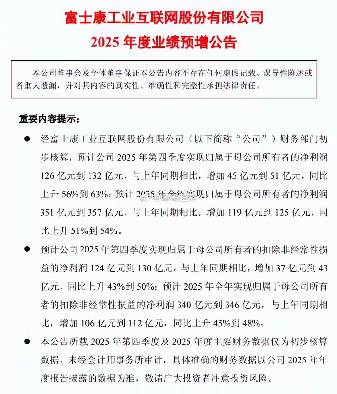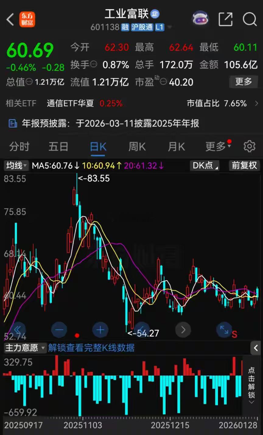 工业富联业绩炸裂!明天抄底还是观望?1月28日晚间,工业富联发布2025年业绩预告,预计2025年全年实现归母净利润351亿元到357亿元,同比增长51%到54%,以此计算,公司在去年平均每天赚近一个亿。具体来看,公司800G以上高速交换机业务营业收入同比增幅高达13倍;公司云服务商AI服务器营业收入同比增长超3倍。这份财报超出市场预期,整体呈现前低后高的强劲增长曲线,打消市场对业绩增速可能放缓的担忧。不过,令人奇怪的是如此靓丽的业绩居然没有在今天盘面有丝毫反应,公司股价以小幅下跌报收。工业富联股价自去年10月高点83.55元/股,一路调整至今60.69元/股,调整幅度近三成。今天业绩预告必然对明天走势产生重要影响,是冲高回落继续调整还是重启涨势冲击历史高点呢?