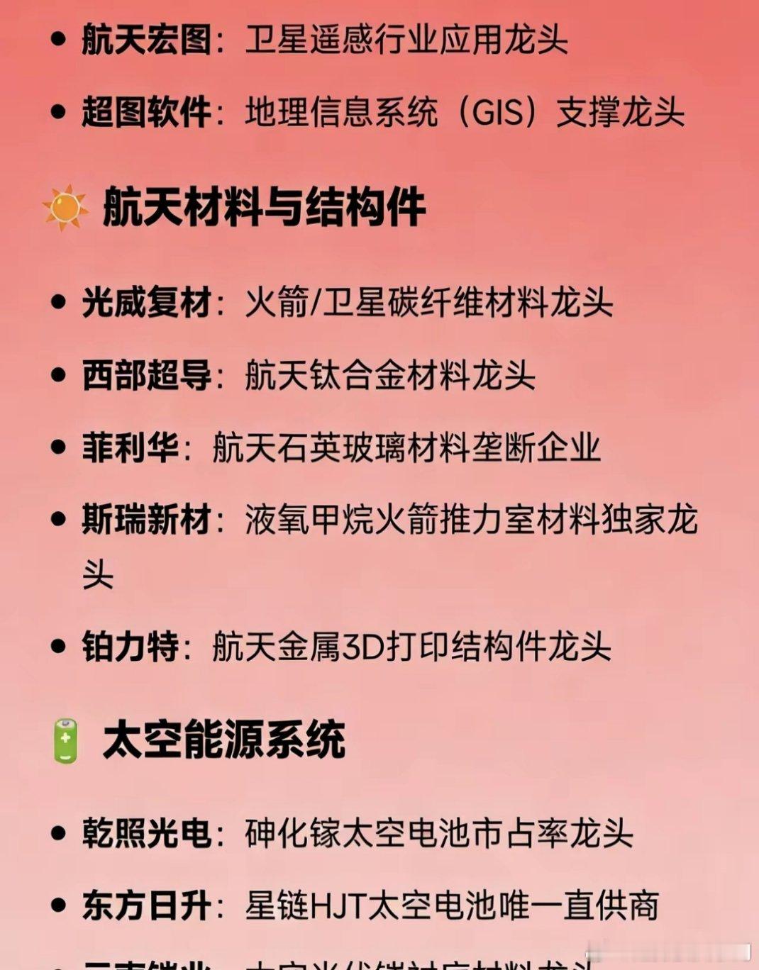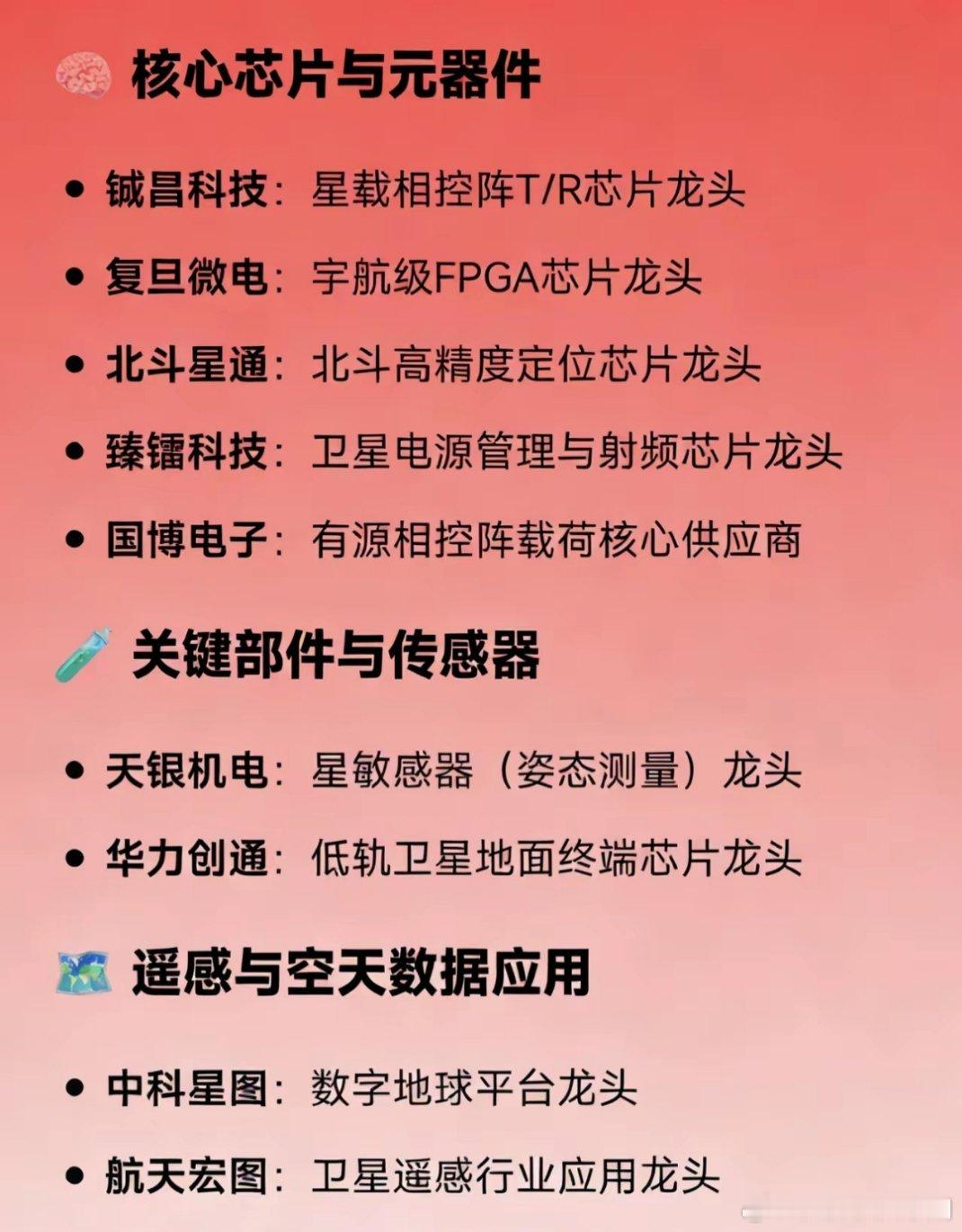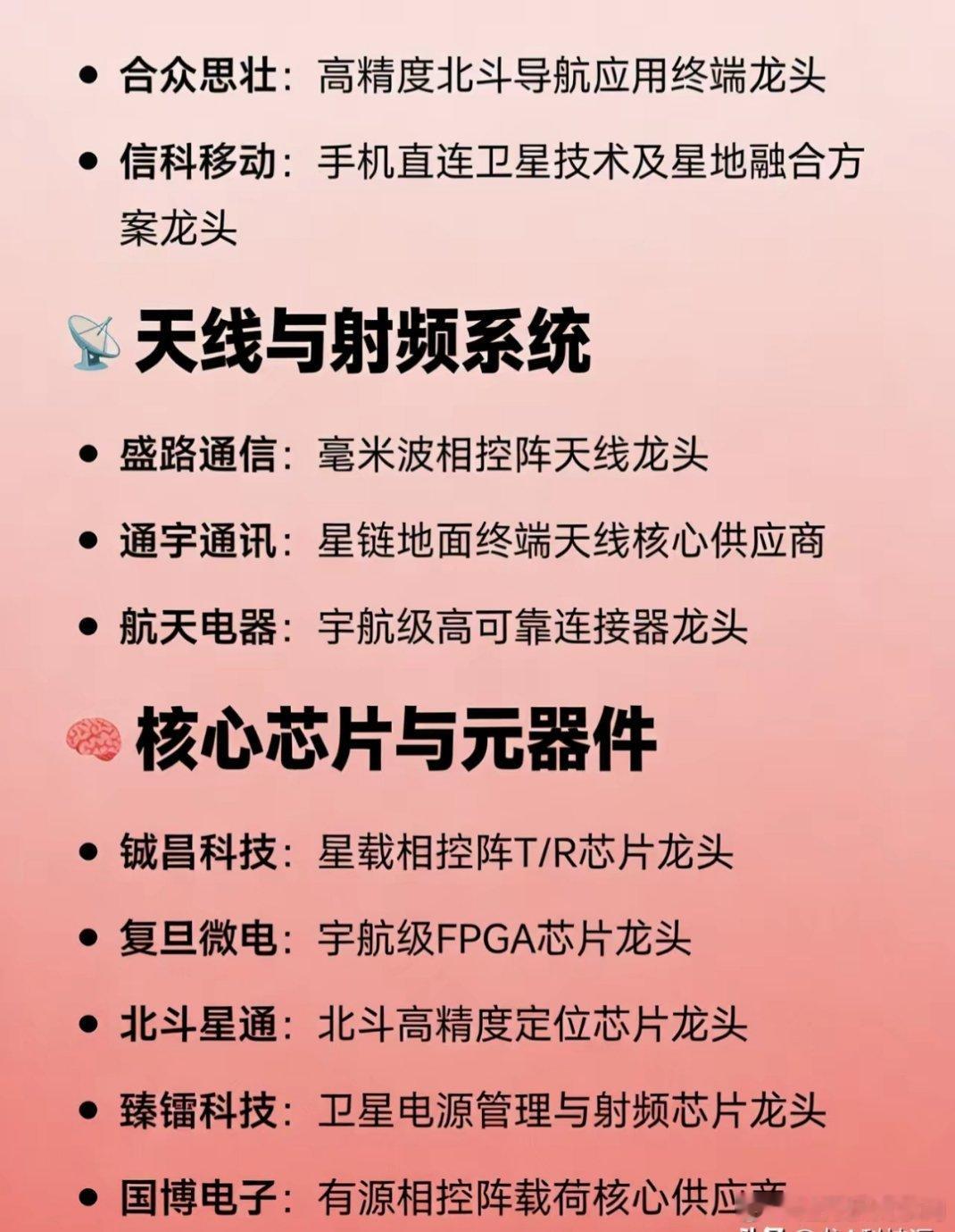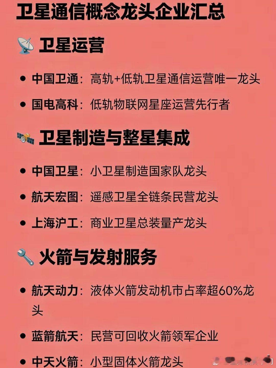 卫星通信概念全产业链龙头汇总📡卫星运营:中国卫通(高轨+低轨唯一龙头)、国电高科(低轨物联网先行者)🛰️卫星制造:中国卫星(小卫星国家队)、航天宏图(遥感民营龙头)、上海沪工(商业卫星总装)🔧火箭发射:航天动力(液体发动机龙头)、蓝箭航天(民营可回收火箭)、中天火箭(固体火箭龙头)📶地面终端:海格通信(军民终端)、华力创通(终端芯片)、信科移动(手机直连卫星)📡天线射频:盛路通信(毫米波天线)、通宇通讯(星链天线核心)、航天电器(宇航连接器)🧠核心芯片:铖昌科技(T/R芯片)、复旦微电(宇航FPGA)、北斗星通(定位芯片)、臻镭科技(电源/射频)🧪关键部件:天银机电(星敏感器)🗺️遥感应用:中科星图(数字地球)、航天宏图(遥感应用)、超图软件(GIS)☀️航天材料:光威复材(碳纤维)、西部超导(钛合金)、菲利华(石英玻璃)、铂力特(3D打印)🔋太空能源:乾照光电(砷化镓电池)、东方日升(HJT太空电池直供)