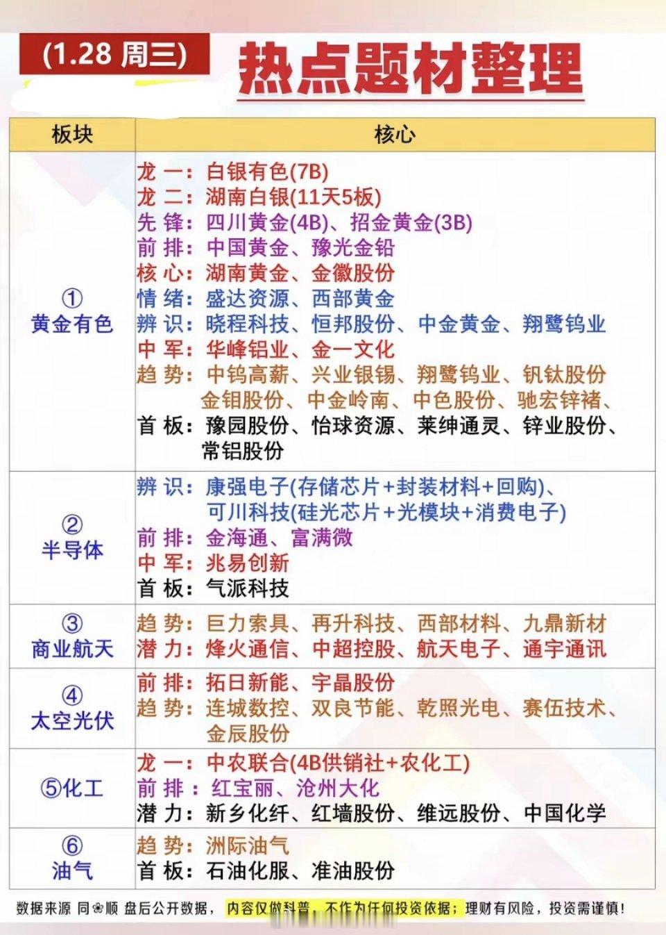 1.28周三 热点题材+龙头股代表!1.黄金有色2.半导体,存储芯片3.商业航天4.太空光伏5.化工原料6.油气开采