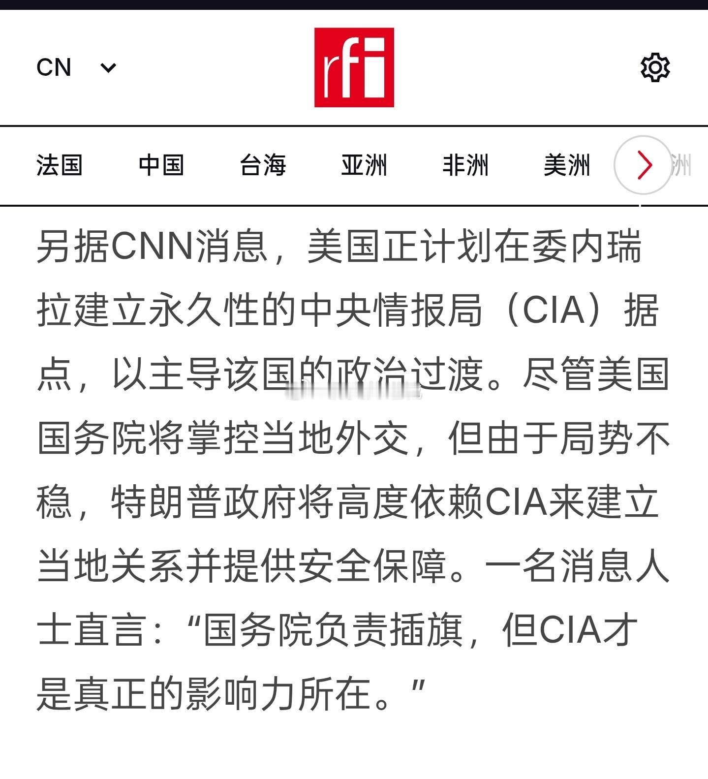 据彭博社周三28日报道,美国国务卿卢比奥表示,特朗普政府已经准备好动用武力,以便委内瑞拉代理总统罗德里格斯最大程度配合美国政策,但也希望罗德里格兹能考量自身利益,主动推动符合美国利益的重要目标。另据CNN消息,美国正计划在委内瑞拉建立永久性的中央情报局(CIA)据点,以主导该国的政治过渡。尽管美国国务院将掌控当地外交,但由于局势不稳,特朗普政府将高度依赖CIA来建立当地关系并提供安全保障。一名消息人士直言:“国务院负责插旗,但CIA才是真正的影响力所在”。海外新鲜事