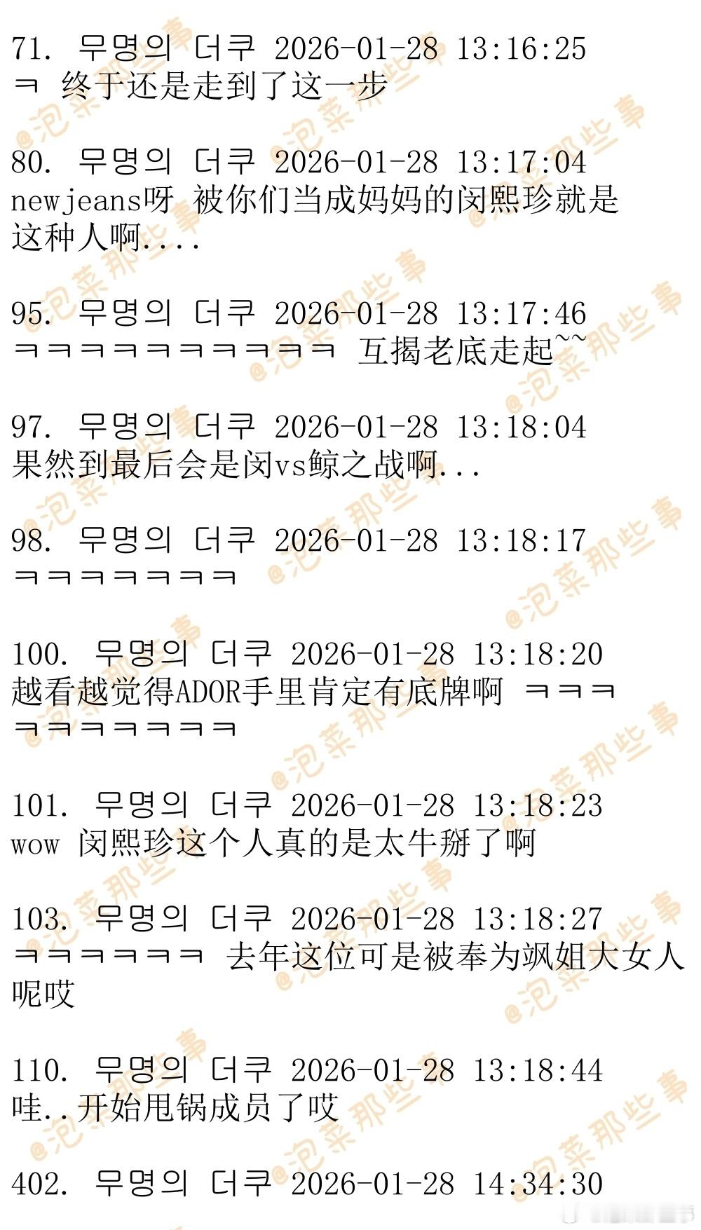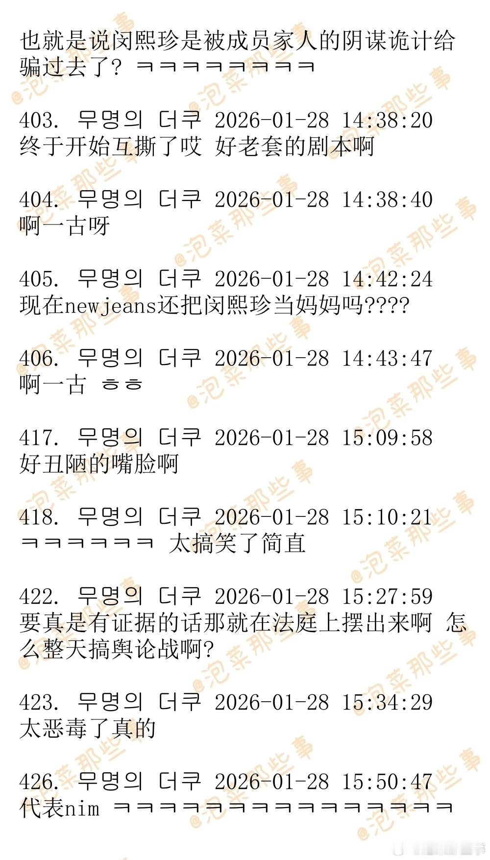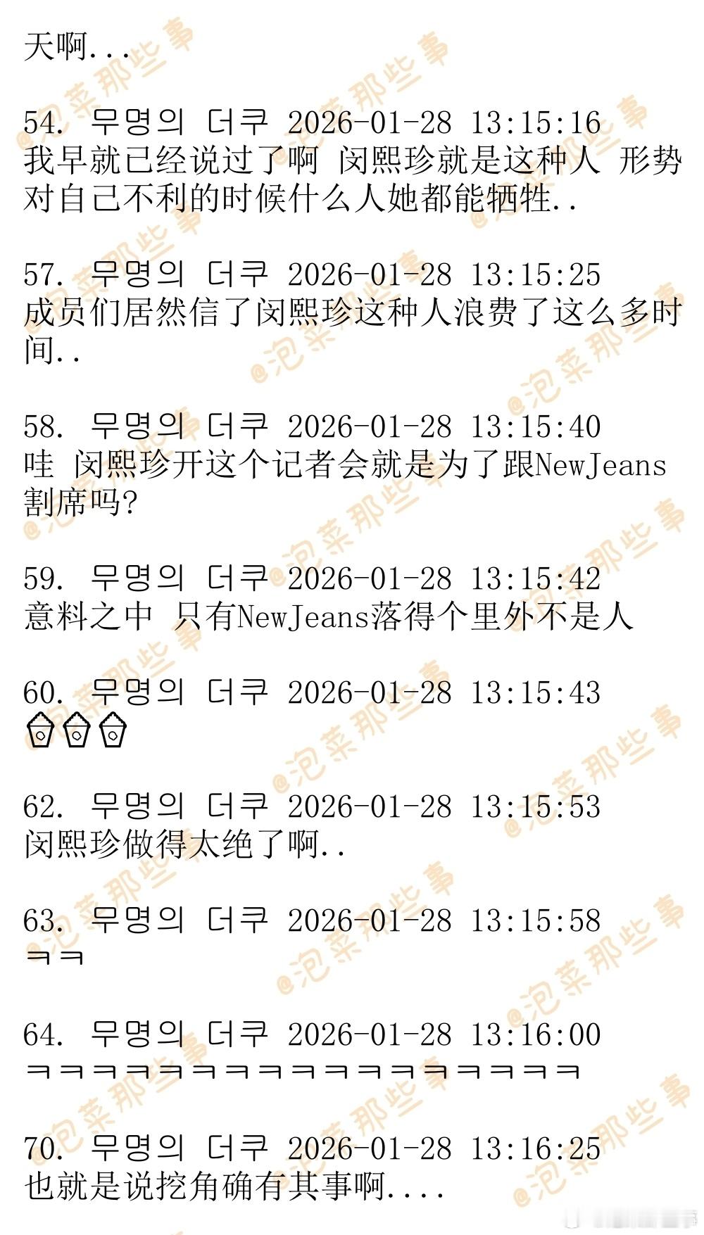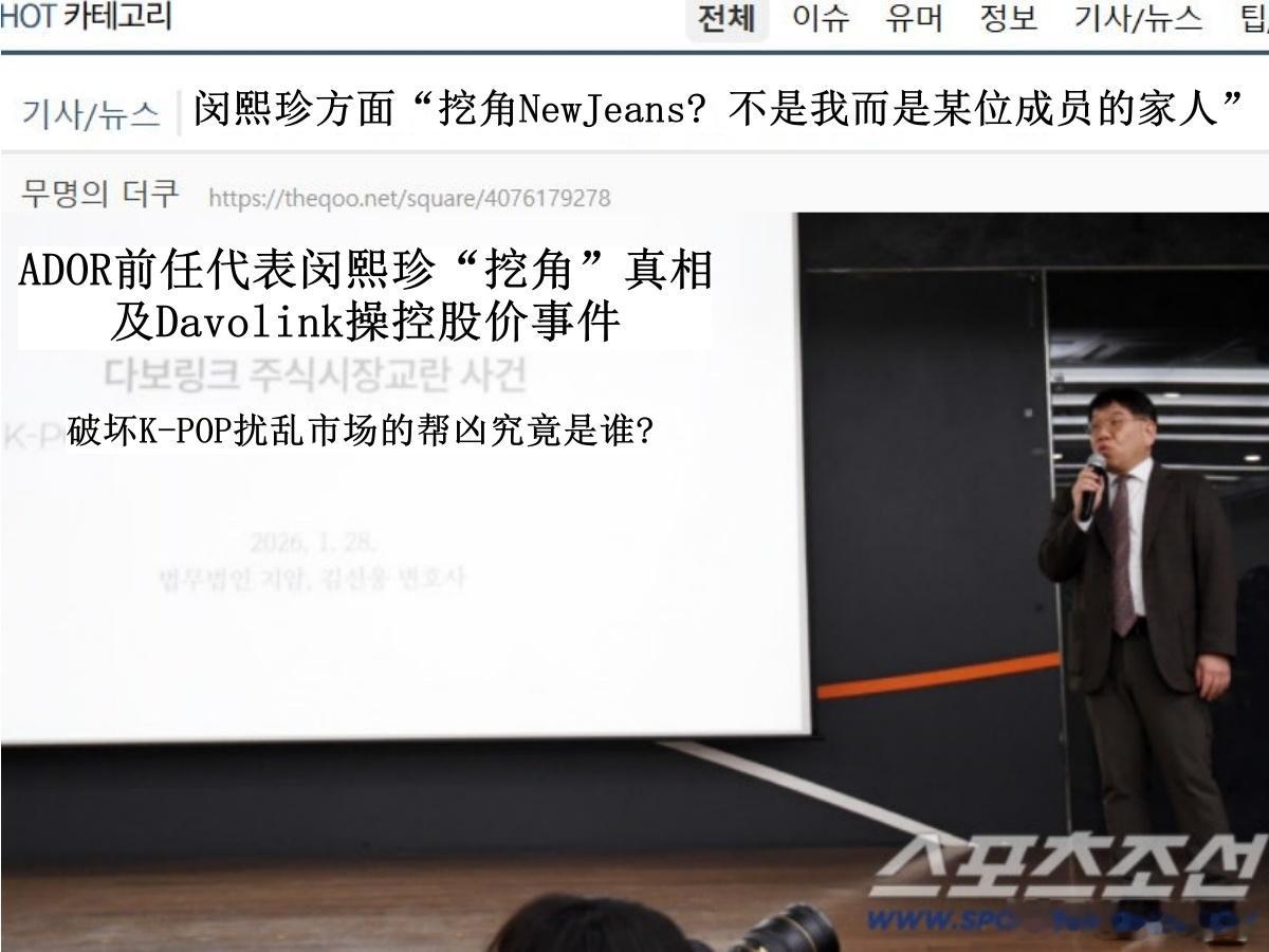 🔥韩网热帖评论翻译🔥闵熙珍控诉NewJeans某成员家人操控股价闵熙珍听了李大伯录音当场晕倒 闵熙珍:试图挖角NewJeans的不是我而是某位成员的家人据韩媒报道,闵熙珍今日委派JIAM律师事务所金善雄律师召开了记者会,公开否认了企图挖走NewJeans的嫌疑,指控NewJeans成员李惠仁的大伯勾结Davolink公司代表朴正圭,企图打着“挖角NewJeans”的幌子,通过散布虚假投资协议、挖角传闻操纵市场炒作Davolink股价获利,代理律师称:“闵熙珍之所以没能亲自出席记者会,是因为问题出在NewJeans成员的家人身上,所以不好开口。前不久更是因为成员家人的态度受到了严重刺激,所以难以出席。”代理律师还透露了闵熙珍召开记者会的原因:“ADOR企图通过与DANIELLE解约来达到解散NewJeans的目的,在与闵熙珍打官司的时候持续不断地恶意利用成员家人,出于对NewJeans的担心,闵熙珍无奈只能选择召开记者会表明立场。”cr.theqoo