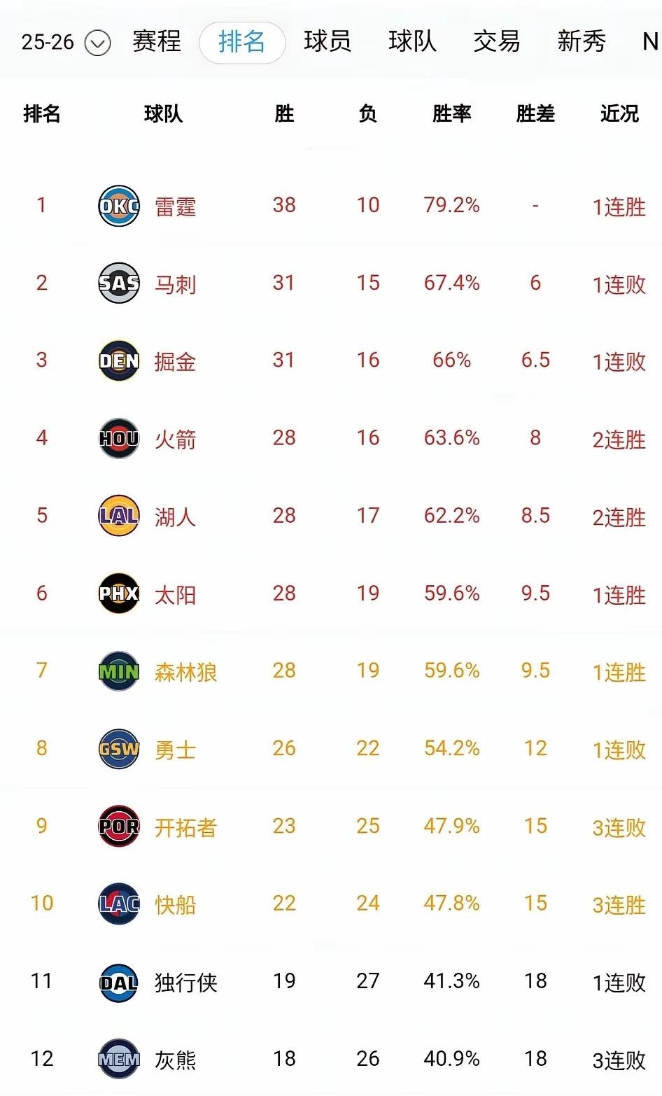 西部竞争太惨烈了!火箭湖人太阳森林狼目前都是28胜,只因负场分列4-7。快船队在过去的19场比赛中赢了16场,目前已经正式追平西部第9。从当初6胜21负的天崩开局,到现在的22胜24负,伦纳德是一场都不拉。开拓者遭遇三连败,杨瀚森创造职业生涯正负值新高,球队排名即将被快船反超。太阳险胜篮网,排名反超森林狼升至西部第六。nba