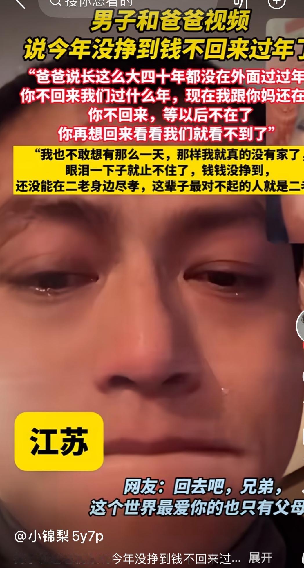过年回不回家,真是个扎心的话题。有男子因父亲视频说没赚到钱就不回家,这背后藏着多少无奈。没赚到钱不敢回,怕亲戚追问、怕父母失落。刷到老家杀年猪视频,香得诱人,可看看银行卡余额,只能发呆。面对三姑六婆的询问,回复都不知咋发。 但也有人赚了钱却没空回,签了百万合同,却只能对孩子说回不去。可夜里总会想起爸妈的饭菜、爸妈的安慰。其实,过年回家,重要的不是钱,是那份团圆。不回家,对父母是愧疚;回家,才是完整的年。