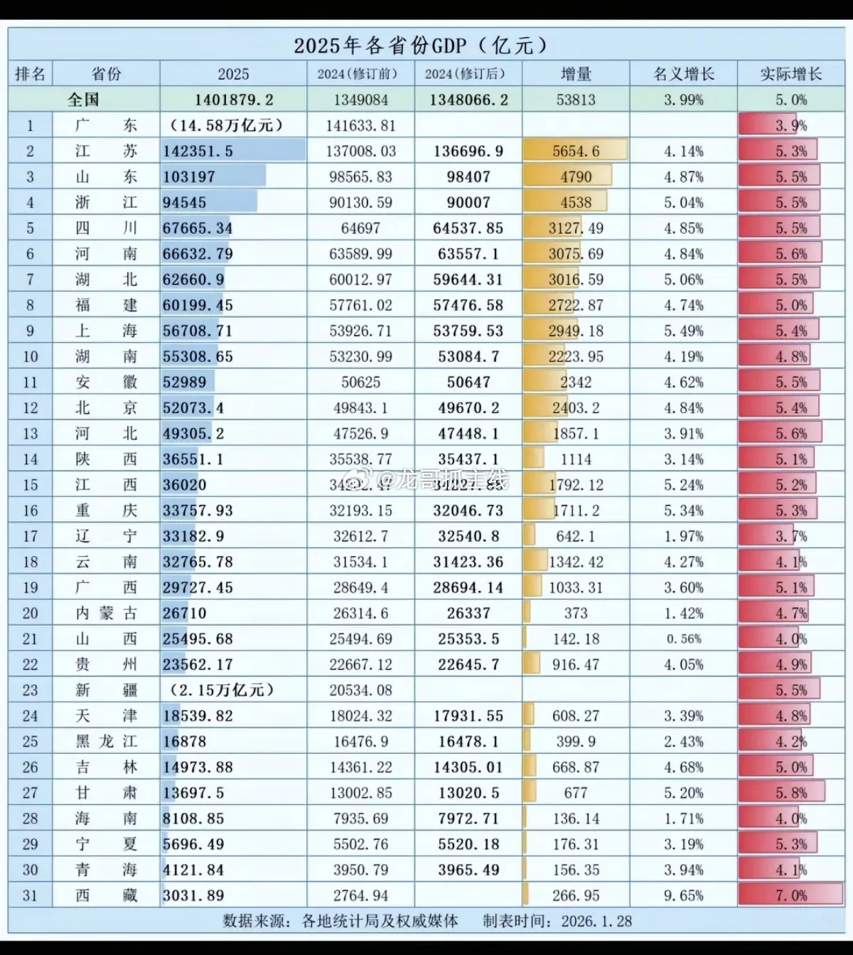 最全:2025年各省份GDP排名 出炉!一、广东GDP总量第一,但增速倒数 第2,增长乏力。二、西藏GDP增速排名第一,7%三、江苏,山东,浙江依次第2~4名 增速5.5%左右,略高于中位数。