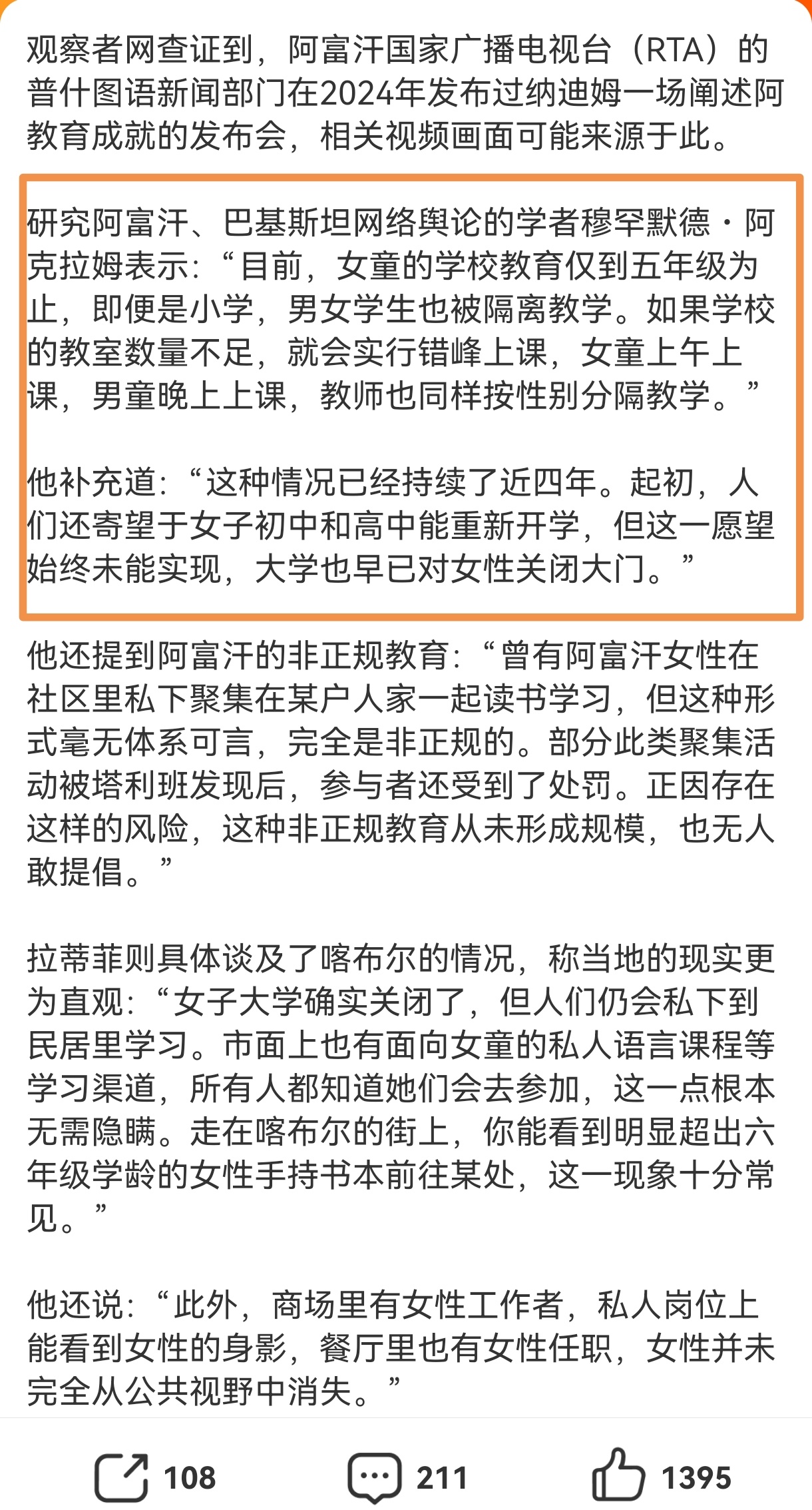 阿富汗禁止女性上学视频为旧闻,但,阿富汗确确实实禁止12岁以上的女孩继续学习,也就是女性教育到小学为止,而且这种情况已经持续了近四年。“起初,人们还寄望于女子初中和高中能重新开学,但这一愿望始终未能实现,大学也早已对女性关闭大门...”阿富汗女性教育到小学为止阿富汗永久禁止女性上学