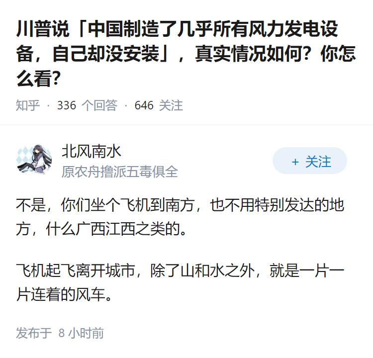 川普说「中国制造了几乎所有风力发电设备,自己却没安装」,真实情况如何?你怎么看?