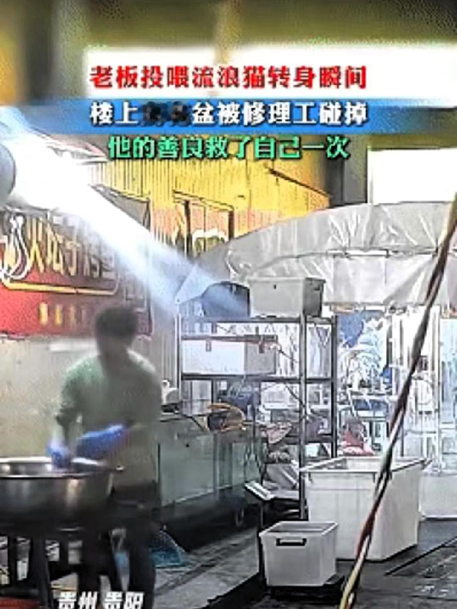 善良救了自己一命,近日贵州贵阳,男子正在摊位上烤鱼,看到一只流浪猫饿得肚子扁扁,脏兮兮地蹲在一旁盯着烤盘,心善的他没多想,随手拿了块烤好的鱼过去投喂,没想到这个简单的举动,竟让他躲过了一场飞来横祸。 就在他离开摊位没几步的瞬间,身后突然传来一声巨响,回头一看,一个花盆狠狠砸在他刚才站立的位置,瓷片碎了一地,想想都让人后怕。 事后打听得知,是楼上的修理工修窗户时,不小心碰落了花盆,店主看着对方也并非故意,心里纵使有气也没过多计较,只暗自庆幸自己躲过一劫。 下楼后,店主发现那只流浪猫还在路边等着,这一刻他更觉得这只小猫是自己的“小福星”。他当即给小猫做了顿丰盛的烤鱼大餐,还决定收养这只小猫,让这份因善举结下的缘分,变成长久的陪伴。 店主把这段经历分享到网上后,引来不少网友热议,大家都感慨小小的善举,竟带来了这么大的幸运。 生活里,很多善举都是举手之劳,对弱小的一份怜悯,对他人的一点善意,看似不起眼,却从不会白费。这些藏在日常里的温柔,未必会立刻有回报,但总会在不经意间,给我们带来意想不到的眷顾。 其实从来没有无缘无故的幸运,那些看似偶然的美好,都是自己积攒的善良换来的。保持心底的善意,对生活温柔以待,这份美好终会以不同的方式回馈给自己。