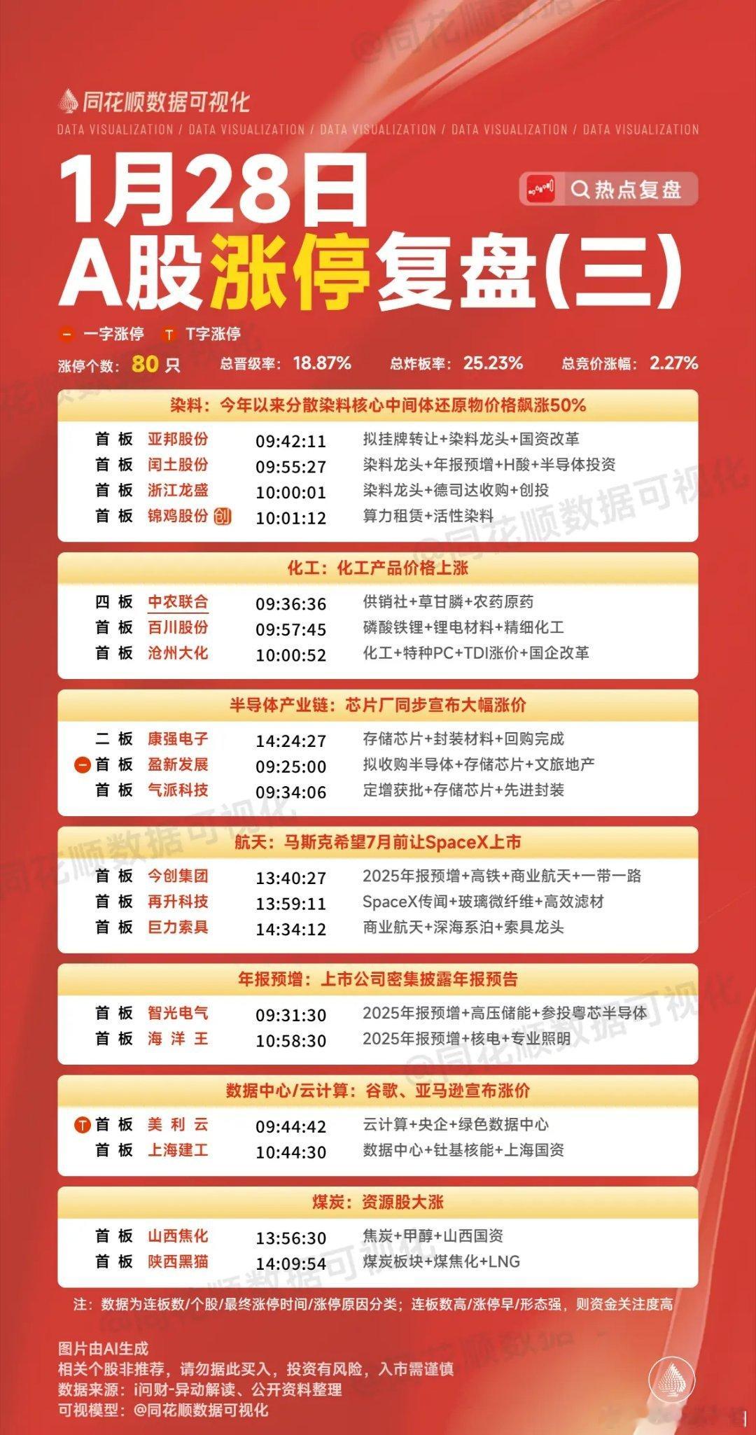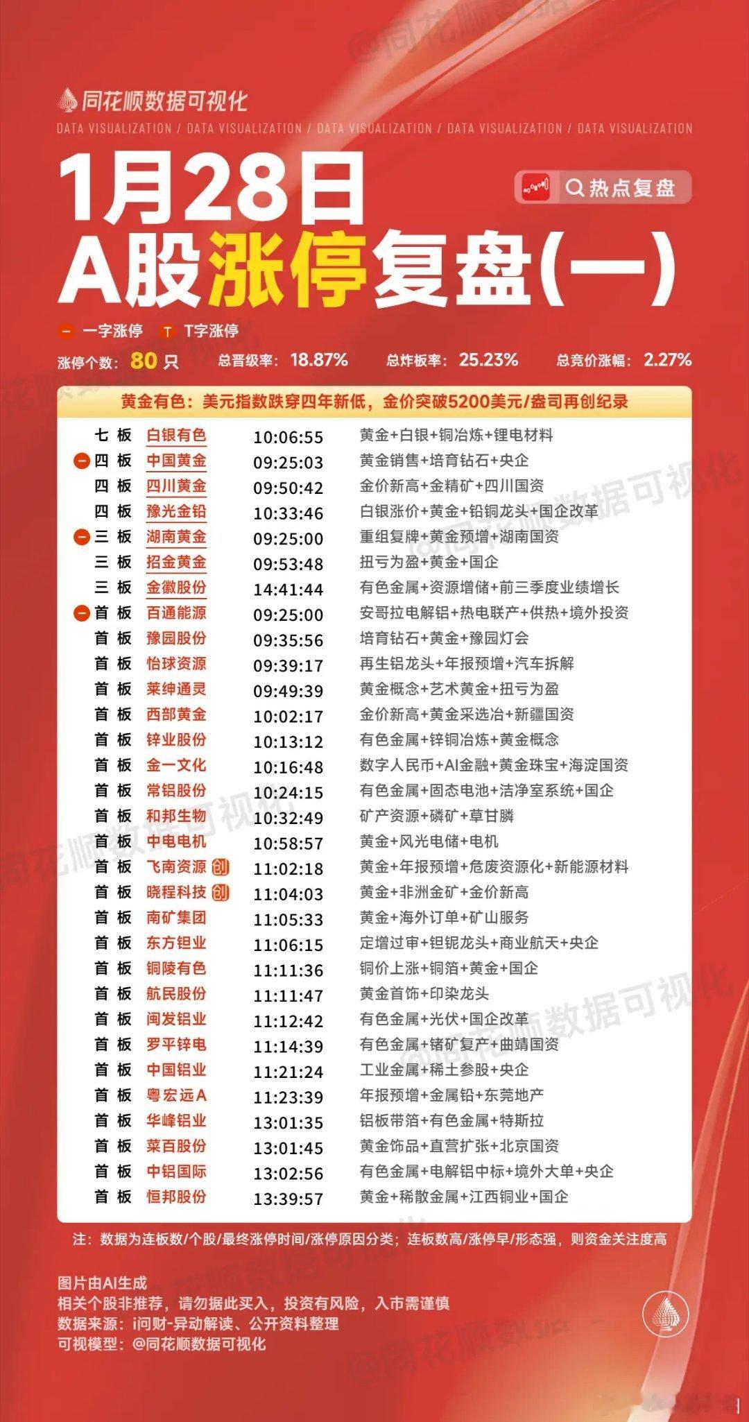 1月28日复盘:白银有色、中国黄金、康强电子、巨力索具、拓日新能隔日走势的一些看法!1、白银有色(白银)白银期货是真的强,昨天夜盘开始还是下杀表现,但是后半夜再次持续走强修复,早盘继续冲高,有色昨天烂板晋级,早盘小幅高开的情况下跟随白银期货日盘共振上涨,并且很快有资金承接封板,在板上小幅分歧后顺利封死涨停,走出了久违的7连板形态!盘后的龙虎榜继续量化霸榜,沪股通净卖出近6亿是今天最大的抛压,榜单整体净流出近7亿,这么大的抛压下仍然能够很快彻底封死涨停,说明市场整体情绪非常强,有色更多的是情绪封板,虽然隔日面临严重异动,但是从湖南触发严重异动的表现看,对于现阶段这个方向并不会有特别大的影响,白银期货的表现依然是判断它持续性的标准,所以今晚夜盘国际银价的表现是关键,如果不出现明显调整,有色就能继续强势,反之,一旦出现明显调整,有色也很可能走出兑现的形态!2、中国黄金(黄金)黄金相比于白银涨幅虽有不如,但是短期内也是大幅上涨的,国黄今天竞价强势一字板对于整个贵金属的强势是有刺激的,而因为黄金期货日盘的强势表现,国黄也是最终稳稳一字封死涨停,走出了强势的4连板!盘后的龙虎榜买盘多为游资席位,卖盘的抛压可以忽略不计,3日榜作手新一入场,买盘也是游资席位居多,卖一是潜藏资金止盈,这是明显的游资入场接力榜单,很明显国黄的榜单说明游资也开始顶不住诱惑开始接力贵金属了,但是它们选择的是相对位置更低的国黄,而且国黄流通市值也更容易拉升,但是这个方向和期货的关联性太大,国黄隔日预期虽然很高,但是如果期货负反馈,它也很难独善其身,所以对于国黄来说,今晚夜盘国际黄金的表现才是它能否走出持续性的关键!3、康强电子(存储芯片)康强竞价近7个点的表现在存储芯片中是最强势的,所以开盘后在板块的强势下有资金做多封板,但是东芯开盘直接下杀的表现带崩了整个存储芯片行情,康强虽然回封非常强势,但是依然反复炸开,直到午后才彻底封死涨停,走出了一个突破的放量烂板形态!盘后的龙虎榜中山东路和张家港东环路两个游资席位加上两个量化是主要的买盘,卖盘中泰湖北分止盈了大部分仓位,章盟主止盈离场,卖盘同样有两个量化离场,这是明显的资金换手接力榜单,康强今天虽然是烂板,更多的是因为板块的情绪因素,而它最终能封住涨停说明做多资金的决心是非常足的,再加上尾盘存储芯片是有一定修复的,隔日板块一旦出现反转,康强是有弱转强概率的,所以它开盘的表现就非常有看点了,只要有资金去引导,它作为今天除了有色金属外极少的连板股,走出冲高的概率还是比较大的!4、巨力索具(商业航天)巨力早盘还是明显弱势表现,但是尾盘却出现明显资金做多拉升,短时间内强势拉升上板,走出了一个比较强势的反包形态!盘后的龙虎榜紫阳东路是打板做多资金,其余买盘多为机构引导,卖盘多为机构和量化席位,华泰深圳前海是早盘就止损的资金,这个榜单还是非常不错的,巨力是近期商业航天高潮时的代表性龙头,它在短时间内的反包至少证明商业航天并没有彻底结束,最近的回调更多的是市场干预影响,那么尾盘巨力的抢先手或许会是商业航天修复的一个前兆,毕竟在近期一波商业航天高潮时,巨力也是提前一天涨停的,隔日板块高潮时开盘直接强势上板确认强势,隔日会不会继续有此表现,就看开盘整个商业航天会不会有明显修复了!5、拓日新能(太空光伏)拓日昨天那么强势的封板,尾盘光伏也有强势修复,按照正常预期,今天拓日就是大幅高开,但是它不到3个点的高开就是偏弱了,但是它毕竟是龙头,开盘还是有资金强势引导去上板,奈何今天的情绪都在有色金属方向,拓日在板块持续走弱时出现资金砸盘兑现,虽然刚炸板时有一定承接,但是并没有资金愿意去做回封,之后开始趋势下杀,但是却始终没有跌破开盘低点,表明资金整体承接不错,最终收盘仍然维持在4个点涨幅!盘后的龙虎榜3个机构席位引导封板,招商益田路买入近5千万,卖盘除了两个机构,也有两个游资止盈,之前做多的成都系1.5亿筹码并没有出现在榜单,要么就是在格局,要么就是昨天这个分歧板兑现了,这个榜单其实非常不错,拓日今天的兑现也是情绪所致,但是没有去承接回封确实是弱势的表现,尾盘没有趁势下杀跌破早盘低点反而不好,隔日开盘向下补缺口的概率还是比较大的,能不能在补完缺口强势承接向上是一大看点,从情绪上看,拓日隔日走出反包的概率不大,它能走出类似巨力一样断板后的大幅低开向上修复的概率最大,所以隔日拓日开盘弱势或许会是一个比较好的低吸点,从情绪上来说,或许会有拉升红盘机会,如果光伏方向出现强势修复,它的表现就更有看点了!本文只限于分享和交流,不构成投资建议,股市有风险,投资需谨慎!