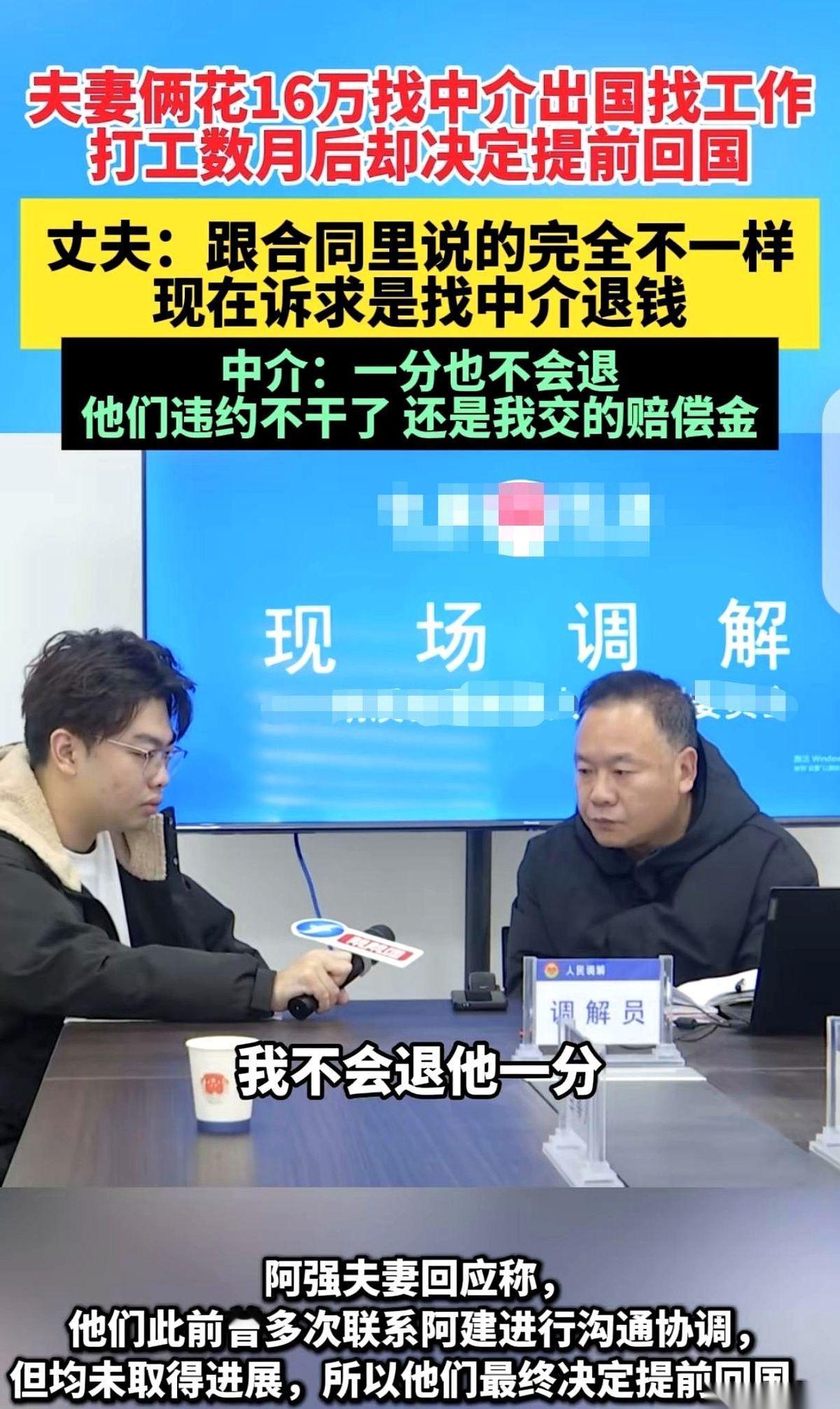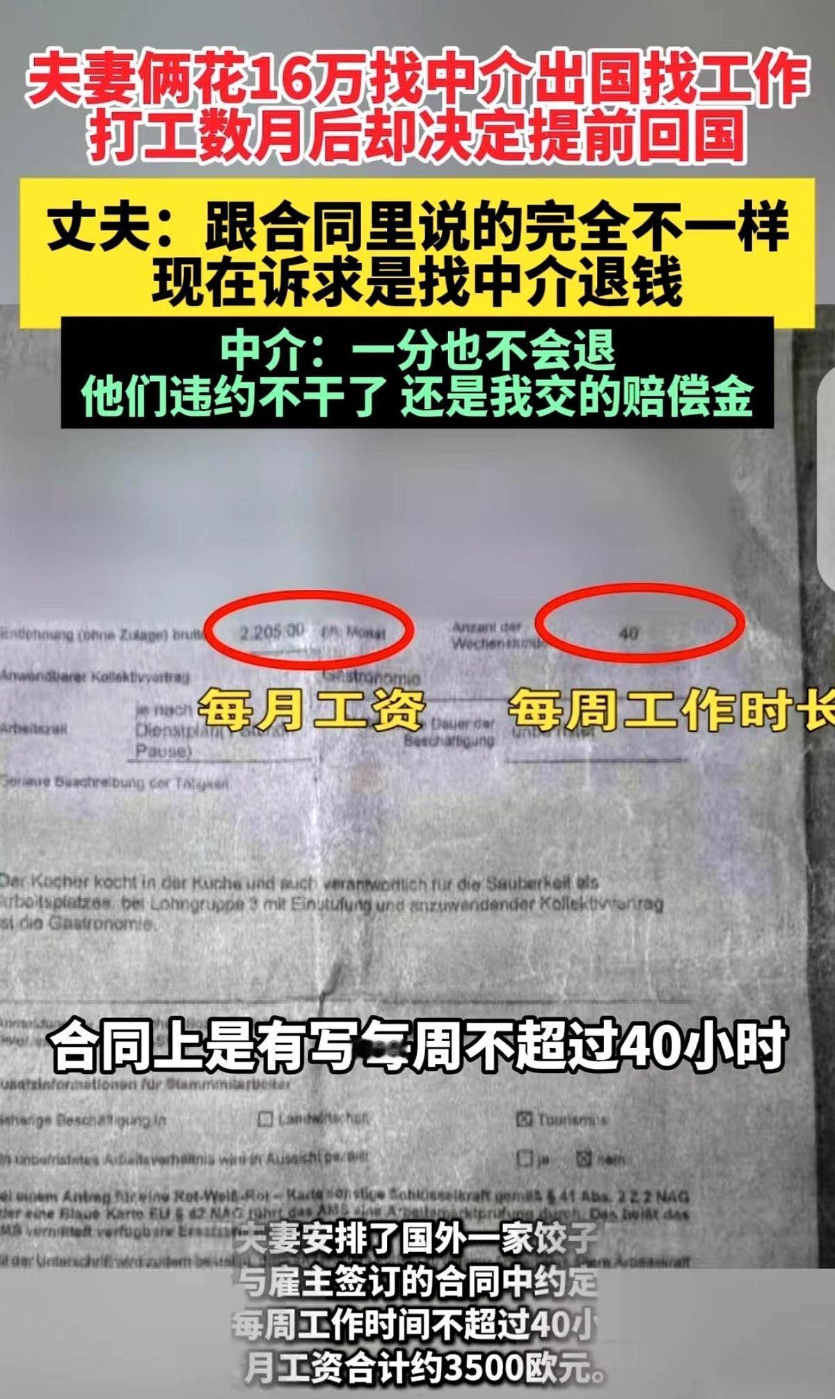 福建一对夫妻,揣着16万中介费,登上了去奥地利的飞机。 说好的,俩人一个月工资加起来两万八,每周最多干四十个小时。 结果飞机一落地,俩人直接站那儿不动了。 所谓的饺子厂,就是个三四个人的家庭小作坊,一股闷热的油烟味儿混着面粉往脸上扑。丈夫阿强本来以为是去做技术活,结果老板指着一堆杂物,意思是什么都得干。 这还不算完。 每天早上八点,机器准时响,再停下,就是半夜十二点。钟表的时针跑一圈半,他俩才能喘口气。 就这么硬扛了几个月,钱没挣着,人先垮了。 两人一合计,打包行李,买票回国。 飞机落地第一件事,就是冲到中介公司,桌子一拍:“退钱!” 中介阿峰从抽屉里拿出一份文件,不紧不慢地推过来。 “退不了。你们中途跑路,算违约,我还替你们赔了7200欧元的违约金,这笔账怎么算?” 夫妻俩当场就站住了,一句话也说不出来。 所以你看,到底是中介画的饼太大,还是自己没看清合同上的字?