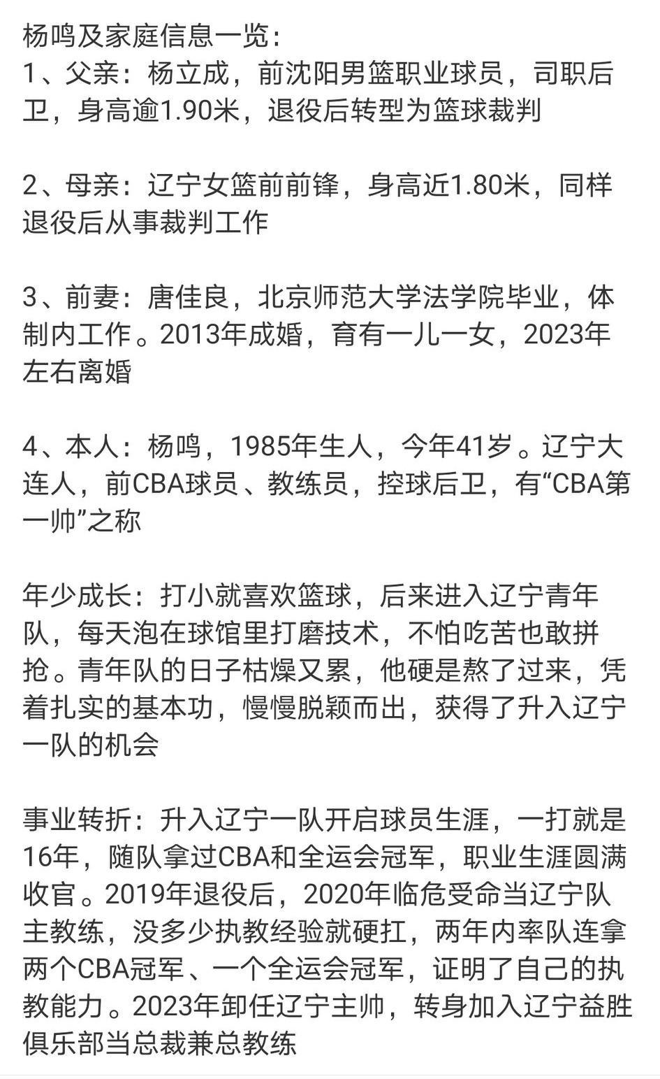 杨鸣出身篮球世家,几年前跟前妻闹得不愉快,两度起诉离婚。 杨鸣球品教品没得说,但人品却不咋地。2019年退役后,2020年临危受命当辽宁队主教练,2022年执教夺冠,2023年身份转换:卸任辽宁男篮主教练,出任辽宁益胜俱乐部总裁兼总教练。后又重任辽宁队主教练,直至今年宣布辞职。