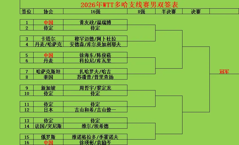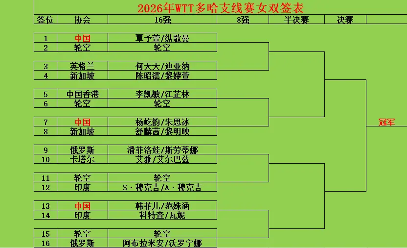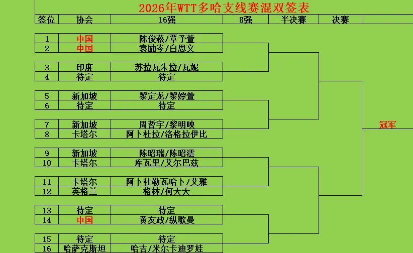 2026年WTT多哈支线挑战赛签表。2026年WTT多哈支线挑战赛签表:男单、女单、男双、女双、混双