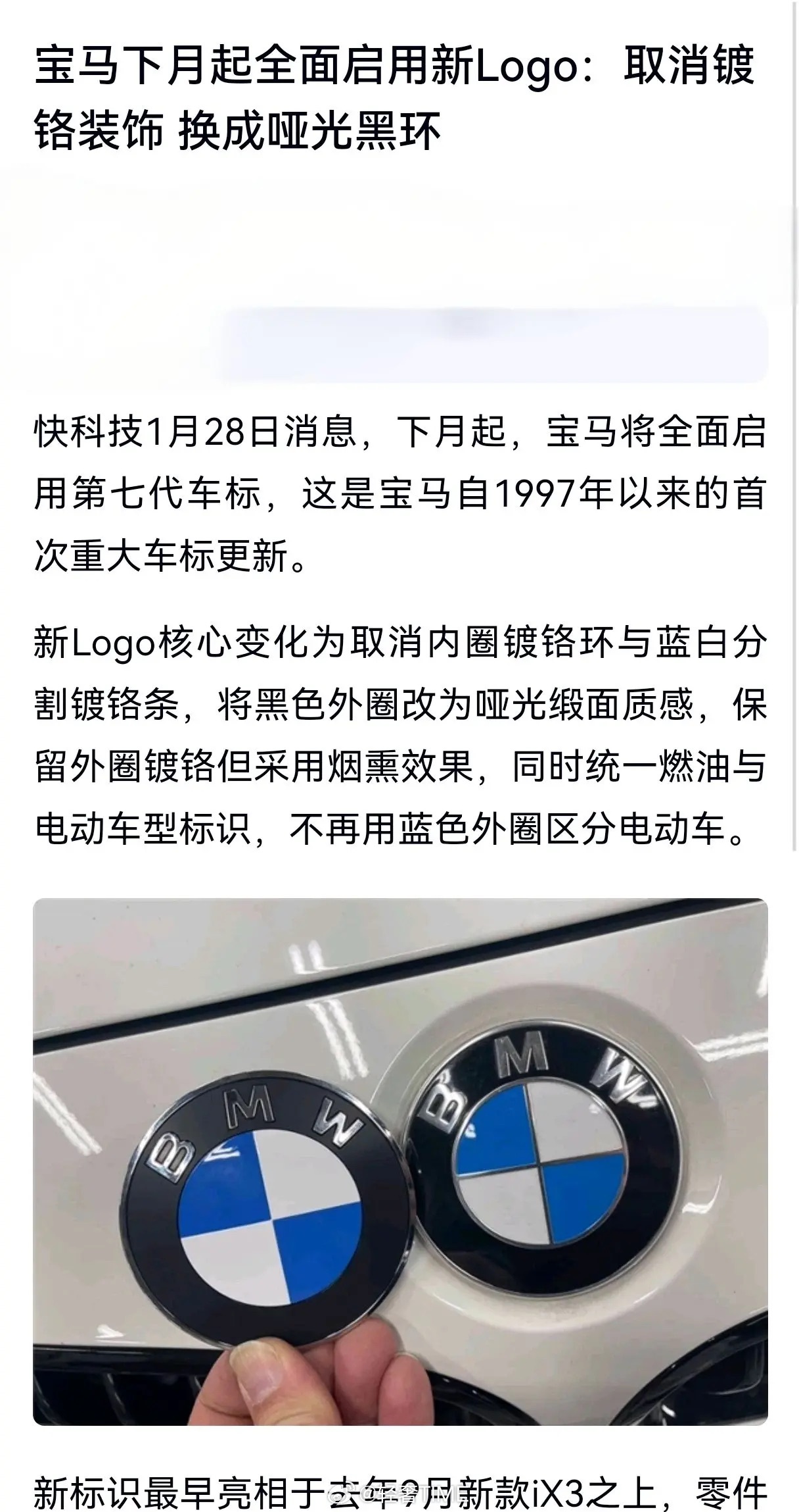 宝马所有车型将启用新logo你看出区别了吗?宝马设计总监奥利弗·海尔默解释,新标旨在“延续品牌传承,同时注入精准感”。镀铬元素的取消呼应数字化时代需求,哑光黑环与扁平化处理符合豪华品牌共性趋势(如奔驰取消立标浮雕、奥迪缩小四环间距)