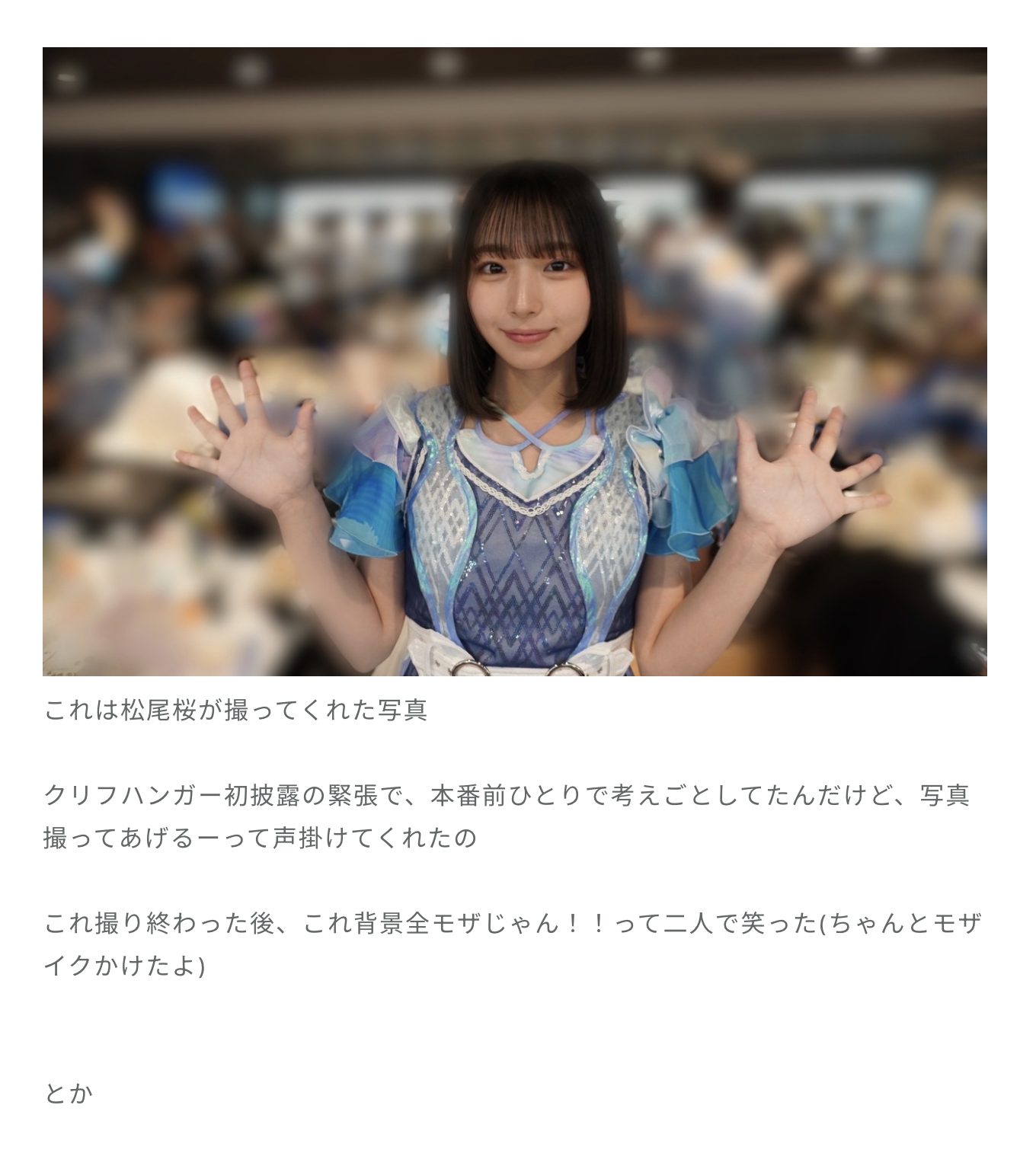 大野愛実「私、いつもブログに載せる写真、自撮りがほぼなくて他撮りばーーーっっかなんですけど、、それは、メンバーが撮ってくれた写真が大好きで。そこには、そのとき一緒に過ごした時間とか、空気とか、笑い声まで写り込んでいるような気がします」
