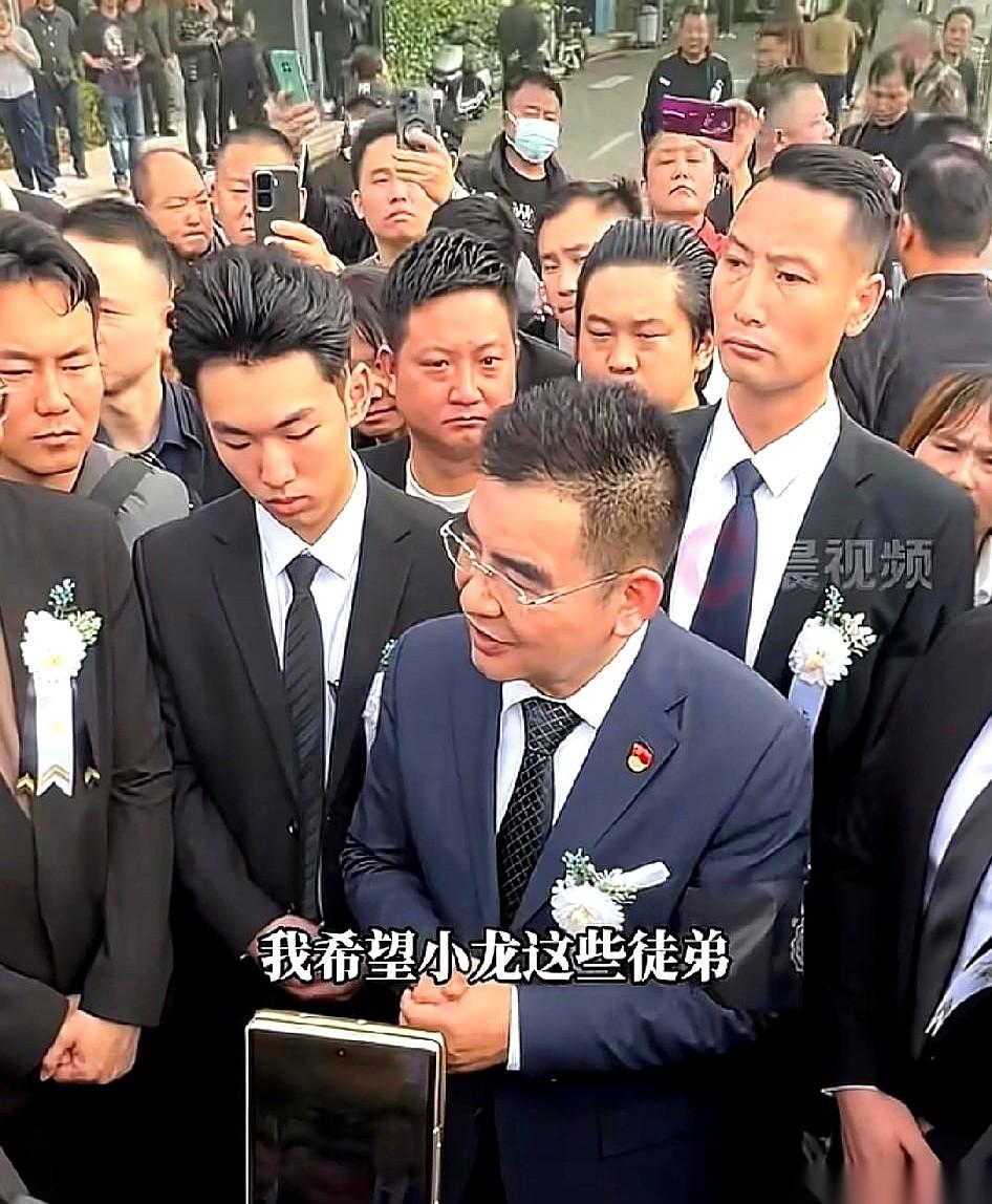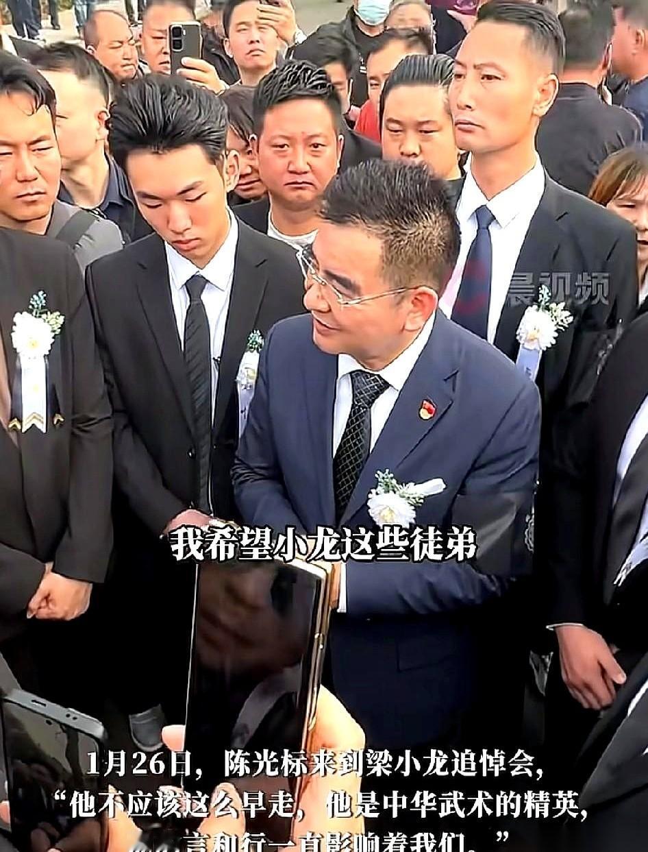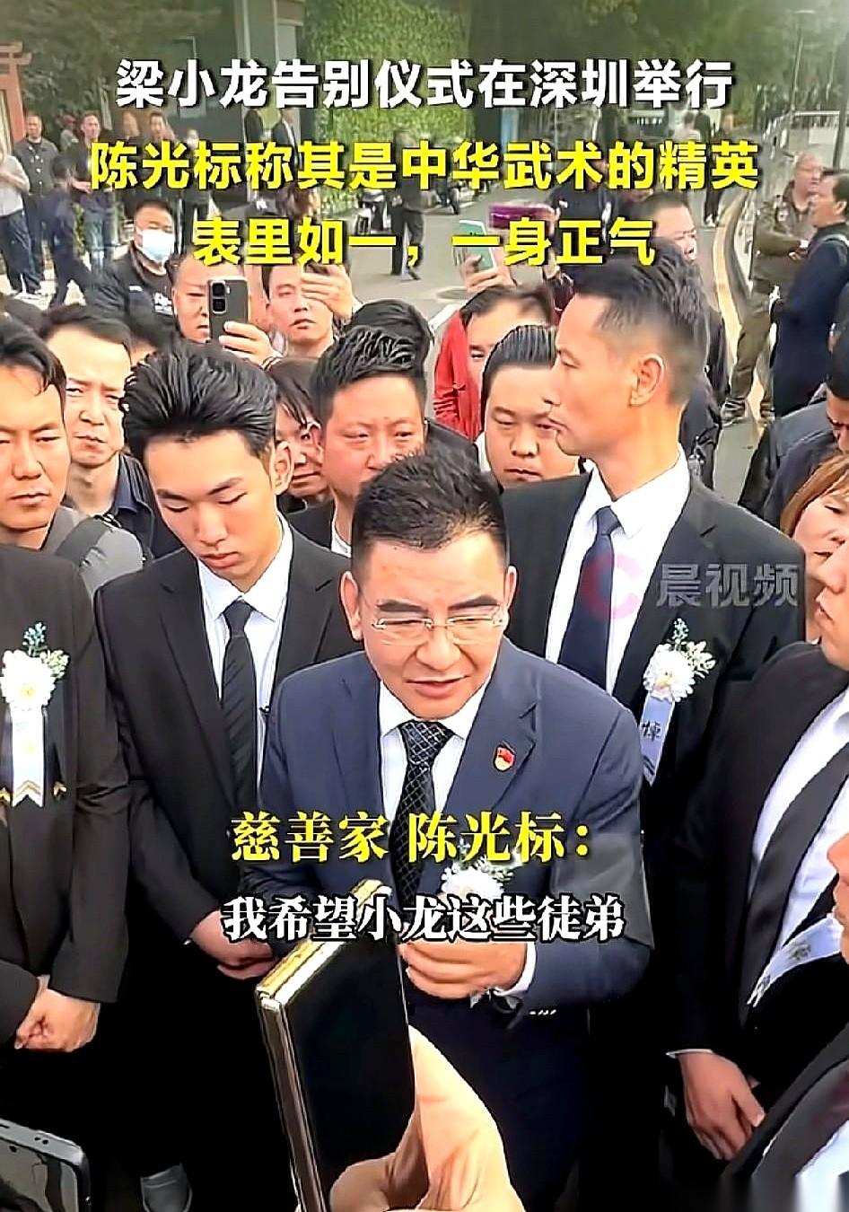 陈光标去参加梁小龙的追悼会。 但他不是一个人来的,身后跟了五个穿黑西装的保镖。胸