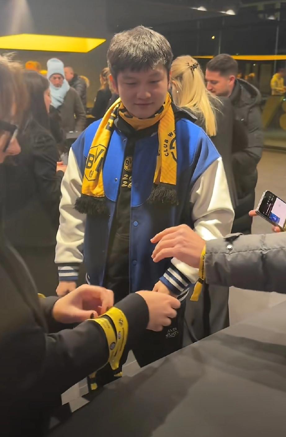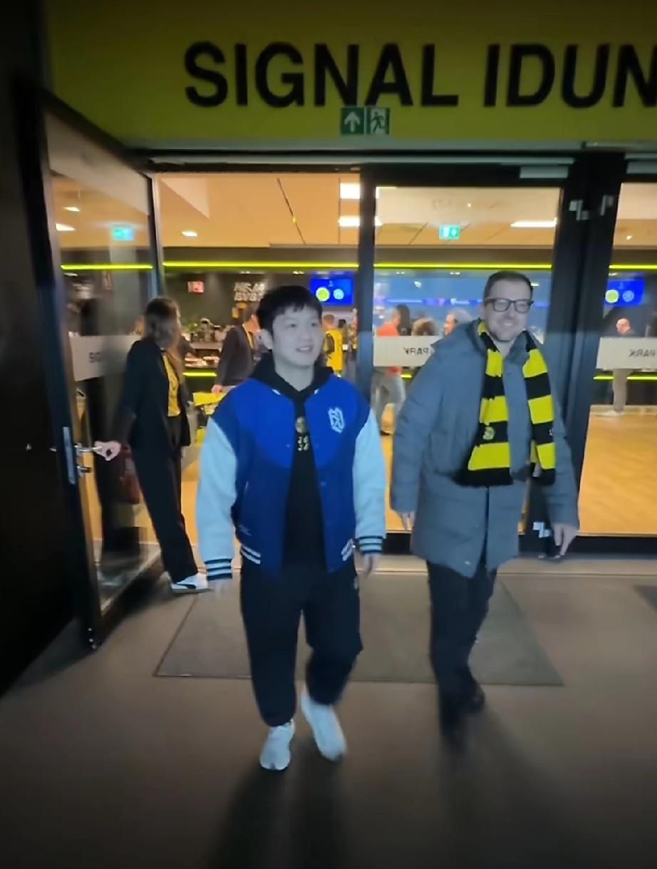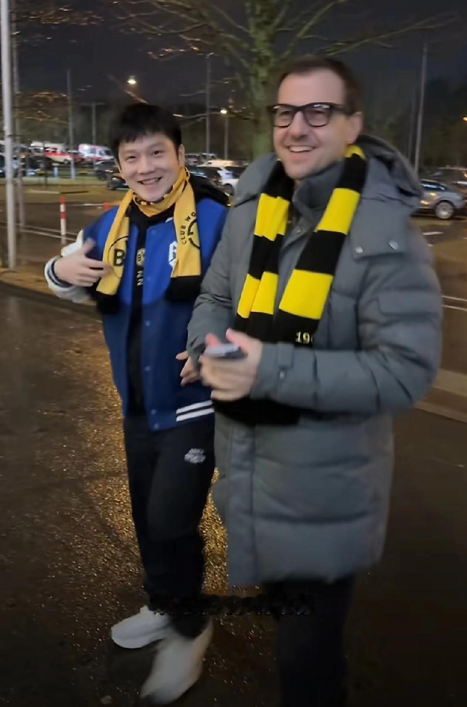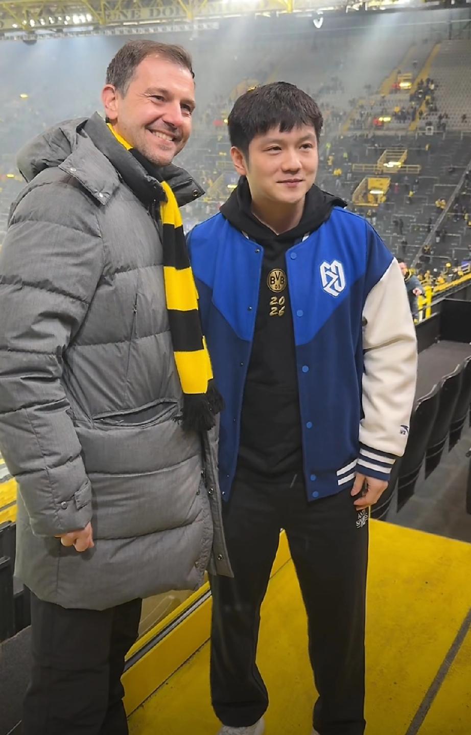 樊振东与老大哥波尔又一起看足球赛了! 这次是樊振东与波尔一起来到多特蒙德,现场观看多特蒙德VS国际米兰的欧冠联赛。 东哥看起来心情不要太好,和波尔大哥一起感觉已经像一家人一样,完全融入当地氛围! 不过波尔穿着长款羽绒服,樊振东只是卫衣套个外套,不愧是血气方刚正当年的年轻人呢! 两个人提前来到球场,趁着观众都还没进场,一起观察了球场,还合了影!