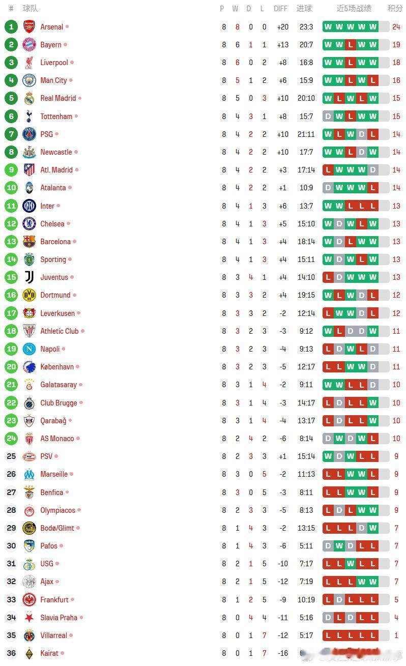 25/26赛季欧冠联赛阶段最终排名:前8直接晋级16强⬇️阿森纳、拜仁、利物浦、