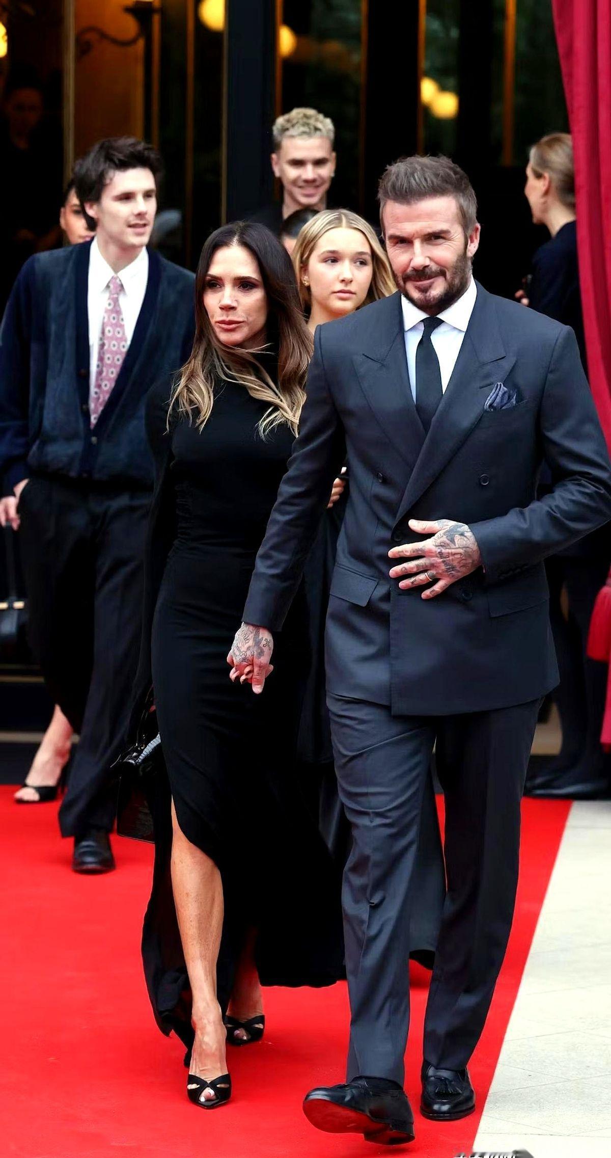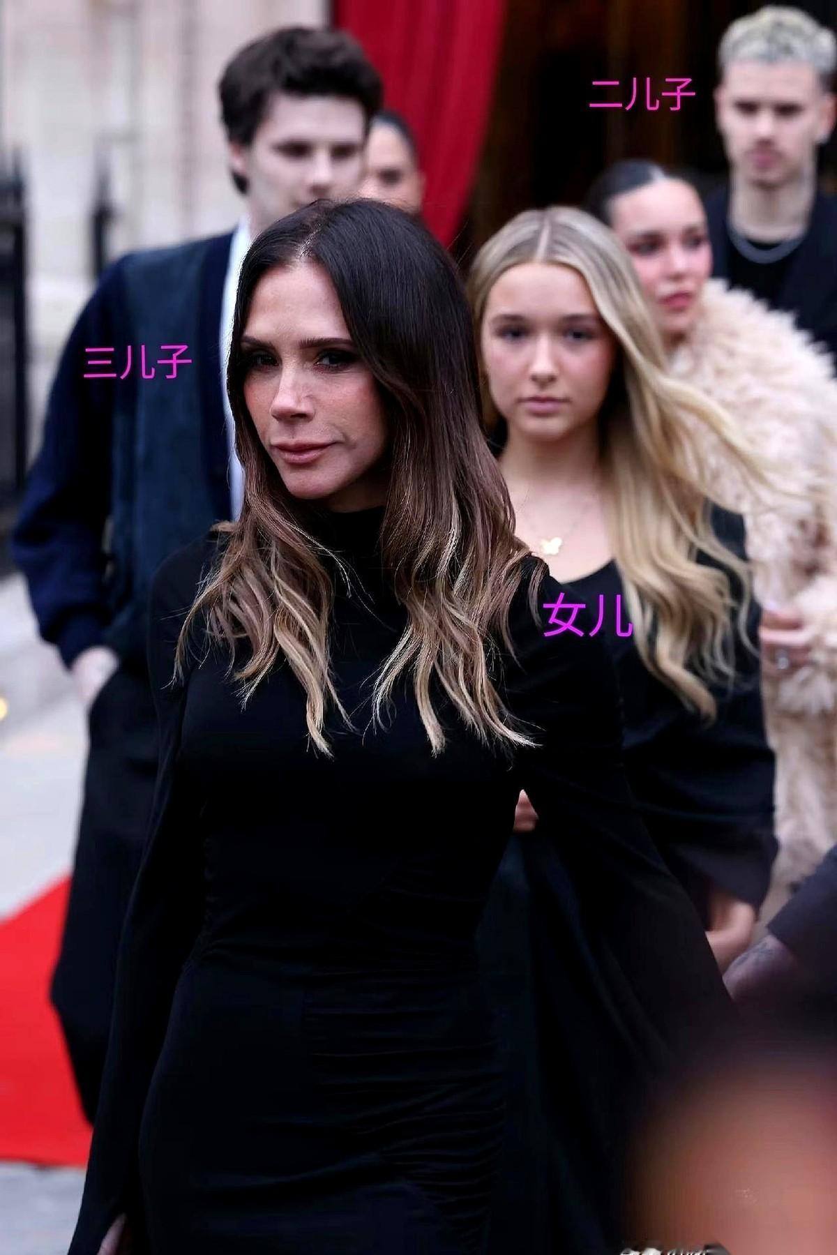 贝嫂维多利亚这一招,真叫人后背发凉。 前脚刚被大儿子和儿媳妇公开叫板,后脚,她就拉着家里剩下的人,齐刷刷出现在巴黎时装周的镁光灯下。 她丈夫贝克汉姆,一身笔挺的黑西装,像个沉默的保镖。维多利亚自己,一袭高领黑裙,下巴绷得像弓,裙摆的开叉几乎亮到大腿根。 最绝的是她身后。 二儿子牵着女朋友,三儿子搂着女朋友,就连14岁的小女儿都紧紧跟着。一家人,穿着色调统一的“队服”,从车上鱼贯而出,硬是走成了一支队伍。 维多利亚走在最前面,细细的高跟鞋踩在地上,一步一下,每一步都像在宣告:看清楚了,这才是我的家人。 镜头疯狂闪烁,所有人都在下意识地寻找,但那个画面里,就是没有大儿子和他妻子的位置。 什么叫家庭地位?不是嘴上争来的,而是看在合照里,谁能站在那个核心位置,谁,又被悄无声息地“裁”了出去。 这一仗,话都没说一句,但好像什么都说了。