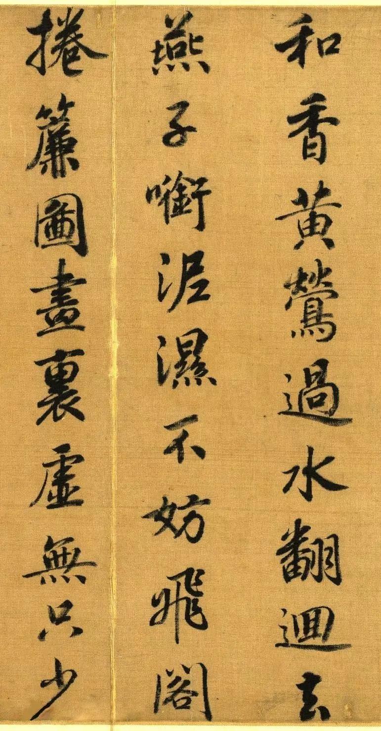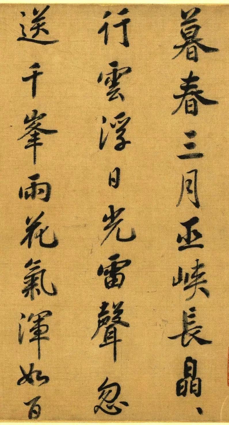 宋高宗赵构《暮春三月诗帖》,绢本48.7X70.3厘米,台北故宫博物院藏。 此幅诗帖以中锋书写杜甫的七言律即事诗,章法疏朗,字体匀称、圆润,墨色统一,令人看来赏心悦目。 【释文】暮春三月巫峡长,皛皛行云浮日光。雷声忽送千峰雨, 花气浑如百和香。黄莺过水翻回去,燕子衔泥湿不妨。飞阁卷帘图画里,虚无只少对潇湘。
