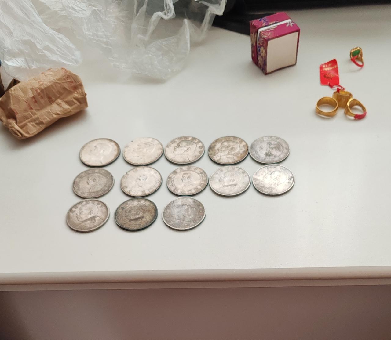 这十四枚银币,现在能值多少钱?大头四枚,小头四枚,帆船四枚,龙洋一枚,还有一枚,分辨不清,