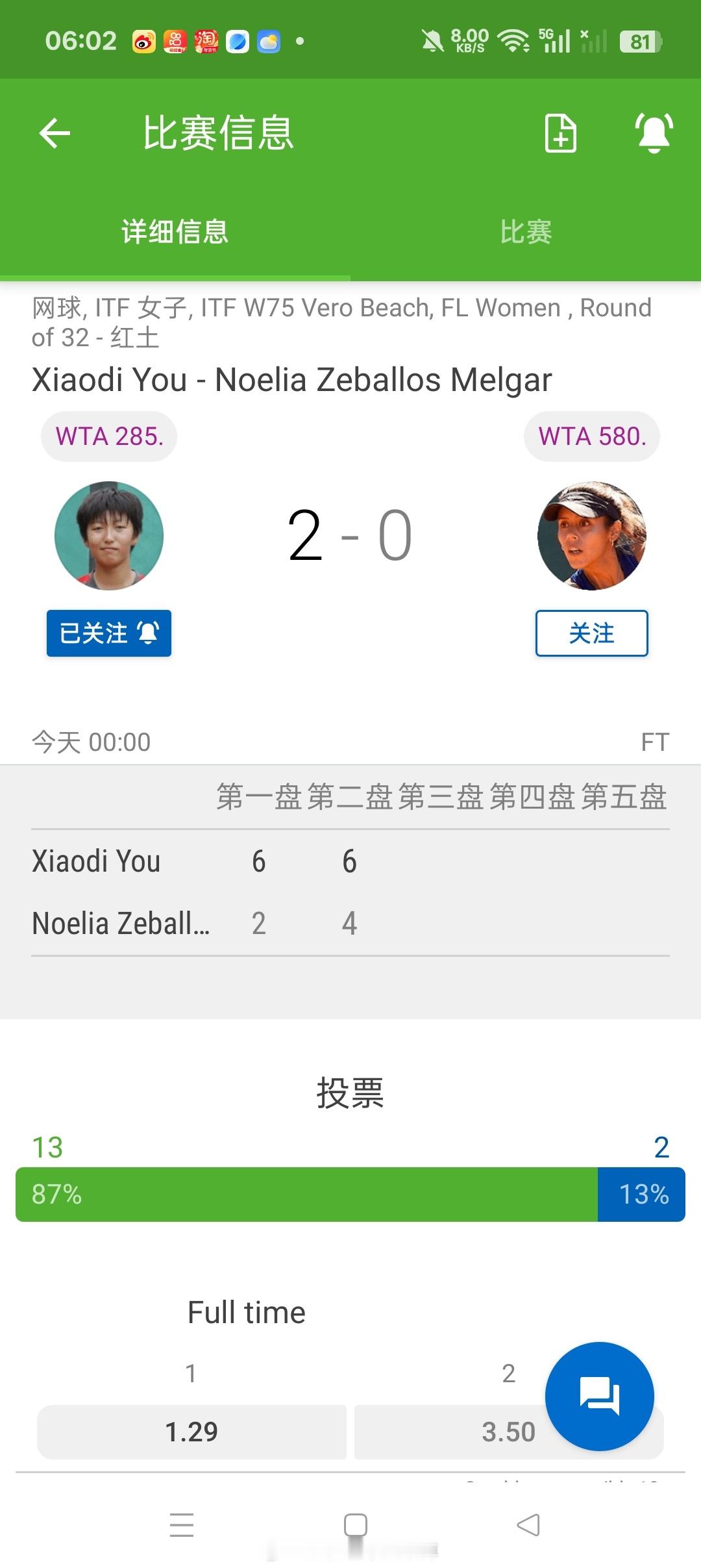 小花小草资讯 【维罗海滩W75】女单正赛第一轮尤晓迪🇨🇳 6-26-4击败🇧🇴球员泽巴洛斯晋级第二轮尤晓迪收获9分下轮的对阵7号种子佩尔里即时排名282(+3)