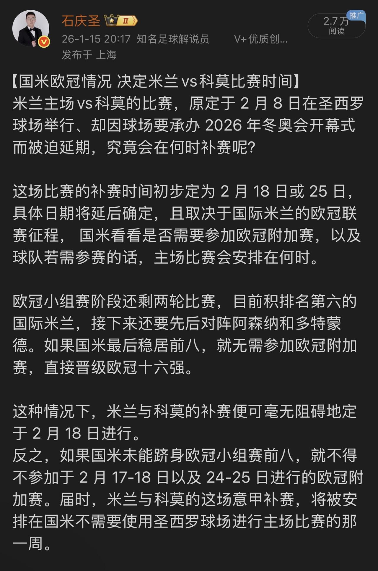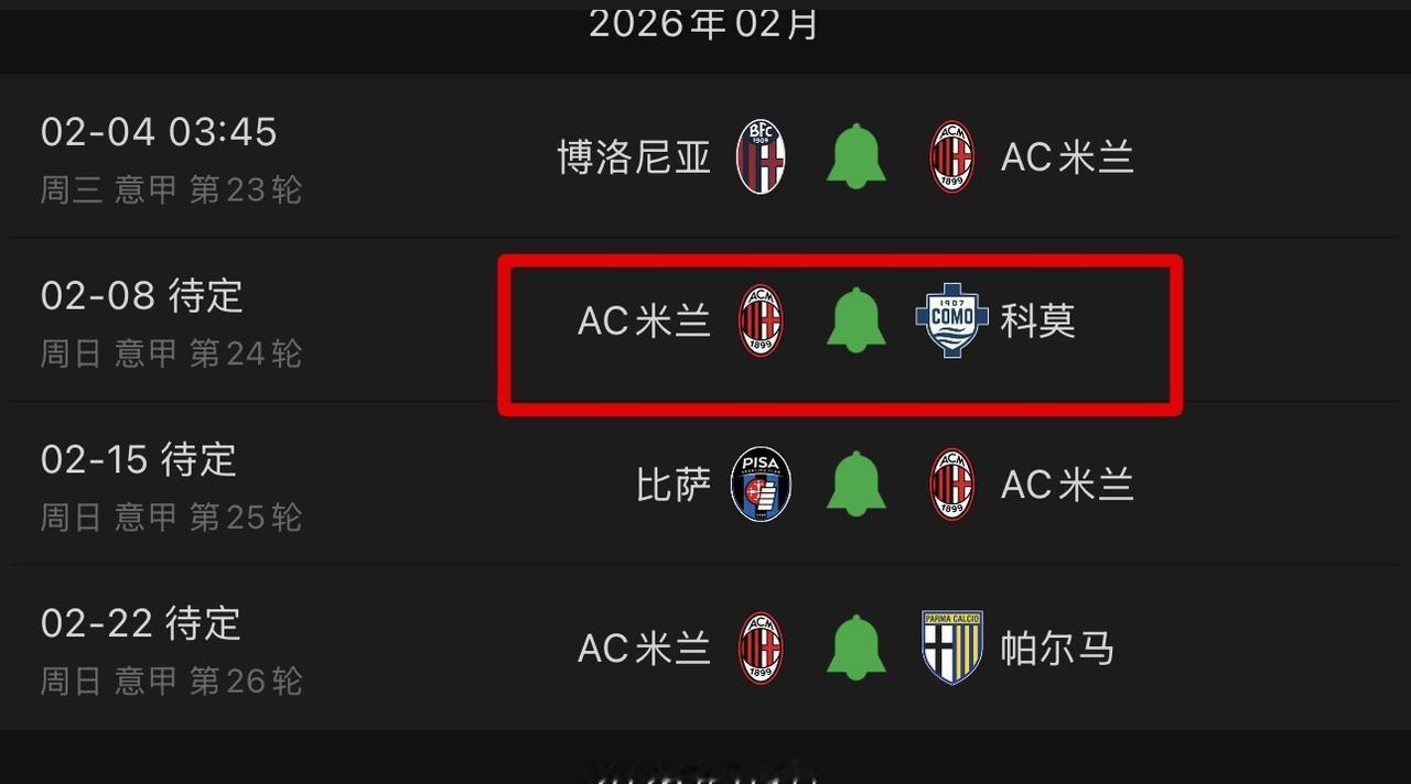 【米兰vs科莫 比赛时间基本定了】因为国米踢附加赛,先客后主,也就是2月17/18欧冠比赛日圣西罗是空的,所以米兰vs科莫大概率放在2月18号踢了,2月下旬,莫名其妙来个,比萨 科莫 帕尔马,的小双赛。 希望前面米兰的大量休息时间,莱奥 普利西奇好好养养伤,咱们4个前锋目前3个带伤作战