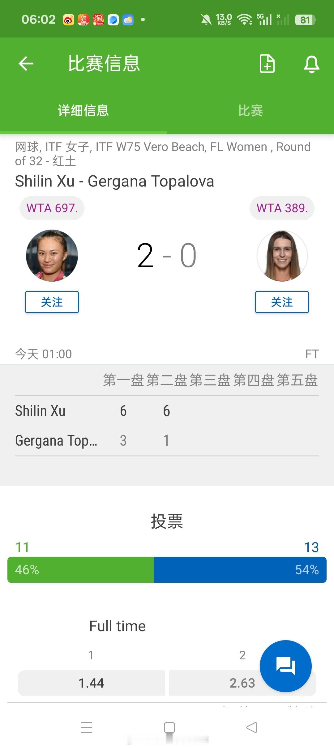小花小草资讯【维罗海滩W75】女单正赛第一轮🇨🇳资格赛突围的徐诗霖6-36-1横扫🇧🇬球员托帕洛娃 晋级第二轮徐诗霖收获12分即时排587