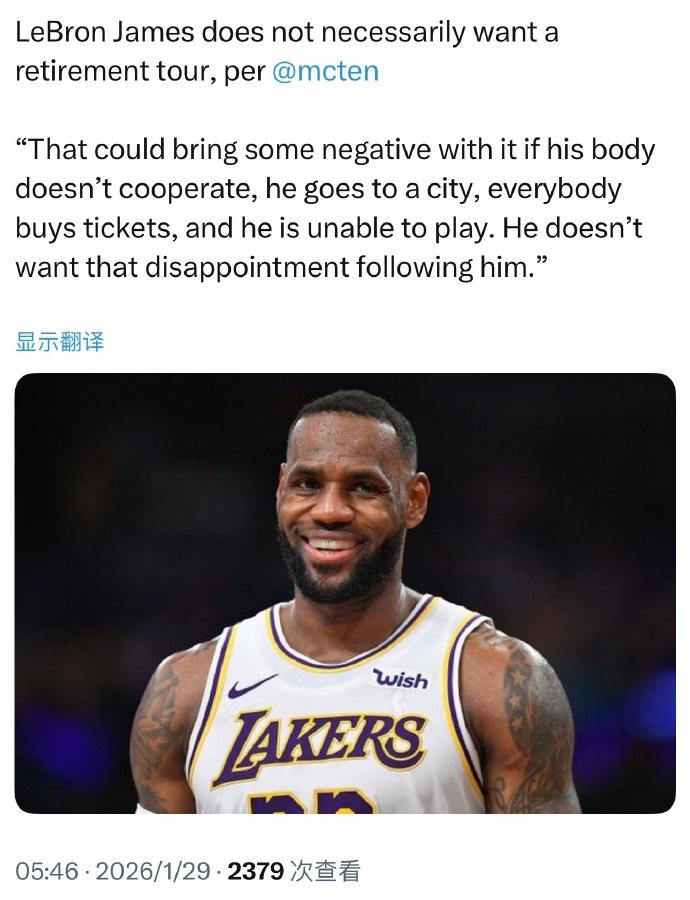 詹姆斯不搞退役巡演? 湖人记者Dave:“詹姆斯未必想要办退役巡演。如果他的身体状态不配合,去到一个城市,所有人都买了票,他却打不了,那可能会带来一些负面的影响,他不想让那种失望一直跟着自己。” 詹姆斯现在的健康状况并不算出色,尤其是如今比赛节奏加快,球员各种腿筋伤势出现,詹姆斯也没法保证自己能打多少场比赛。而如今的各种拉伤,只要出现伤病就是两个礼拜甚至一个月,这对于搞退役巡演非常不利。 且在科比搞完退役巡演之后,后来者再搞就难免会形成对比,办的好了说你是模仿者,办的差了就是拙劣的模仿者,两头不占,完全没这个必要。 最好的方式就是赛季结束后,翻翻黄历,挑一个日子开个发布会,来个金盆洗手即可,戛然而止也是非常好的结果了。
