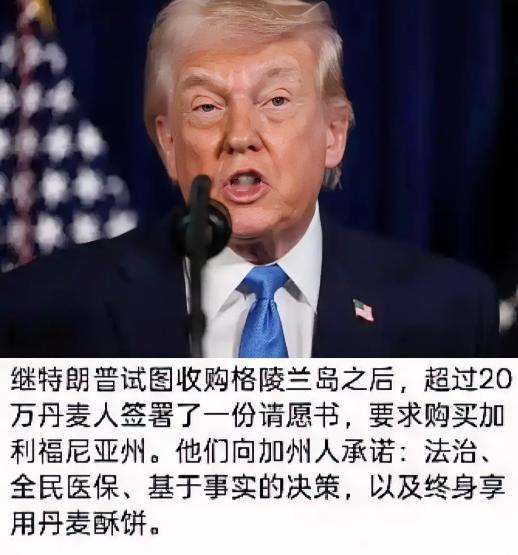 特朗普彻底傻了, 他万万没想到,他还没买到格陵兰岛,反而被20万丹麦人签署了一份请愿书,要求购买加利福尼亚州。 特朗普打格陵兰岛主意那会儿,算盘珠子响得隔着大西洋都能听见。他盯着北极航道的战略位置,惦记稀土矿的开发权,觉得只要掏出商人惯用的“报价—威胁—成交”三板斧,就能复刻美国19世纪买路易斯安那的故事。可他忘了,2026年的丹麦不是1803年财政破产的法国,格陵兰也不是任人买卖的殖民地——85%的岛民举着“不卖”的牌子,丹麦首相直接把主权红线焊死在谈判桌上。 白宫的剧本里,或许还留着1917年花2500万买维尔京群岛的经验。但这次他们算错了账:格陵兰自治法规定主权变更必须全民公投,而就算不谈法律,单算经济账——美国智库估算收购成本近万亿,相当于全年军费的三分之一,国会山的老爷们第一个跳起来反对。更别提北约盟友集体站队丹麦,欧盟甚至掏出“反胁迫工具”,摆明了要让特朗普偷鸡不成蚀把米。 这头特朗普还在推特上画“2026年格陵兰入美”的大饼,那头丹麦网民直接抄起他的逻辑反击。20万人联署的“买加州”请愿,表面看是段子手的狂欢,实则戳中了美国的软肋:加州贡献全美14%的GDP,缴的税比拿的补贴多800亿,真要“买卖”起来,到底谁占谁便宜?请愿里说的“用安徒生改名迪士尼”“终身供应丹麦糕点”,看似荒诞,实则把特朗普“领土交易”的逻辑扒了个精光——当主权能标价,加州凭什么不能是下一个商品? 更深层的矛盾藏在细节里。特朗普政府前脚威胁停拨加州大学的经费,后脚又想靠“金穹”导弹防御系统绑定格陵兰,这种“拆东墙补西墙”的操作,暴露了美国内部的撕裂。加州作为深蓝州,一直是特朗普政策的钉子户——从禁售燃油车到移民政策,双方缠斗多年。丹麦人恰恰抓住了这点,把“买加州”变成一面镜子:你可以用强权欺负盟友,凭什么别人不能用你的规则回敬? 最让特朗普难受的,是这场闹剧里的“时间差”。19世纪买阿拉斯加,美国等得起沙俄衰落;但2026年的格陵兰,等不起三年任期的总统。丹麦和格陵兰的反制不是硬碰硬,而是用法律程序、民意基础和盟友体系织成网——全民公投要谈数年,北约框架绑定安全合作,欧盟反制卡住经济命脉。特朗普想速战速决的商人思维,撞上现代主权国家的韧性,注定寸步难行。 丹麦人的请愿,本质是一场精准的政治解构。他们没直接反驳“购岛”的荒谬,而是顺着特朗普的逻辑推演:既然领土可以买卖,那加州的阳光、科技、牛油果凭什么不能属于丹麦?当20万签名把“让加州再次伟大”的口号改成“丹麦化”,其实是在质问:一个靠威胁盟友、无视民意的购岛计划,究竟是伟大设想,还是帝国幻梦? 这场风波里,最讽刺的不是请愿本身,而是特朗普的误判。他以为金钱和军力能摆平一切,却忘了主权叙事在21世纪的分量——格陵兰居民那句“我们在想下一个千年”,道破了现代领土问题的核心:土地不是商品,而是一代人对后代的承诺。当丹麦人用众筹万亿的玩笑回应强权,他们维护的不仅是格陵兰的冰原,更是主权不可交易的底线。而特朗普到最后可能都没明白,他输掉的不是一桩生意,而是一个时代的游戏规则。