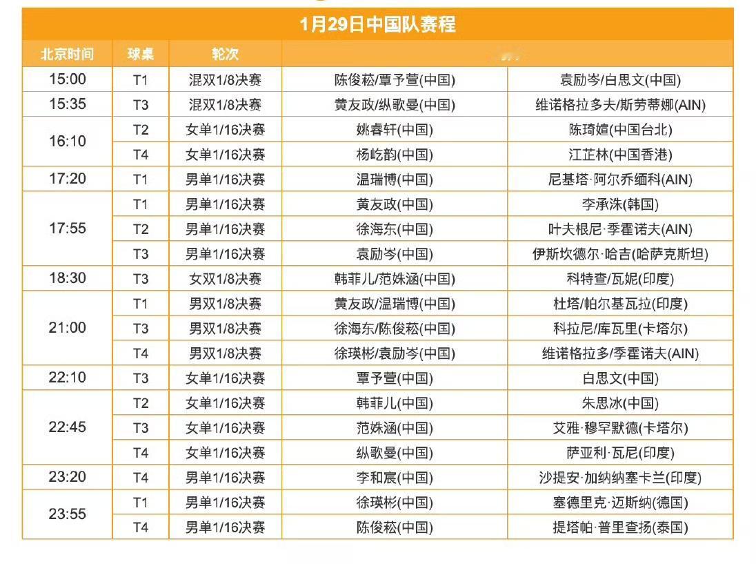 今天(1月29日,周四)赛程! 2026WTT支线赛多哈站1月29日中国队赛程如下图。 今天是正赛的首日比赛,下午三点开战,场场相连,打到晚上六点半,然后晚上九点开始,再打到明日凌晨。 因为是支线赛,咪咕视频、央视频都没有直播,只能翻墙观看,但这样做也非常不妥,也是错误的。 今天温瑞博、黄友政、陈俊菘、徐海东等都有单打比赛,尤其是晚上六点左右黄友政和李承洙🇰🇷的比赛,值得期待,大家就看我发布的战况吧[奋斗]。 (感谢草莓老师的图片)