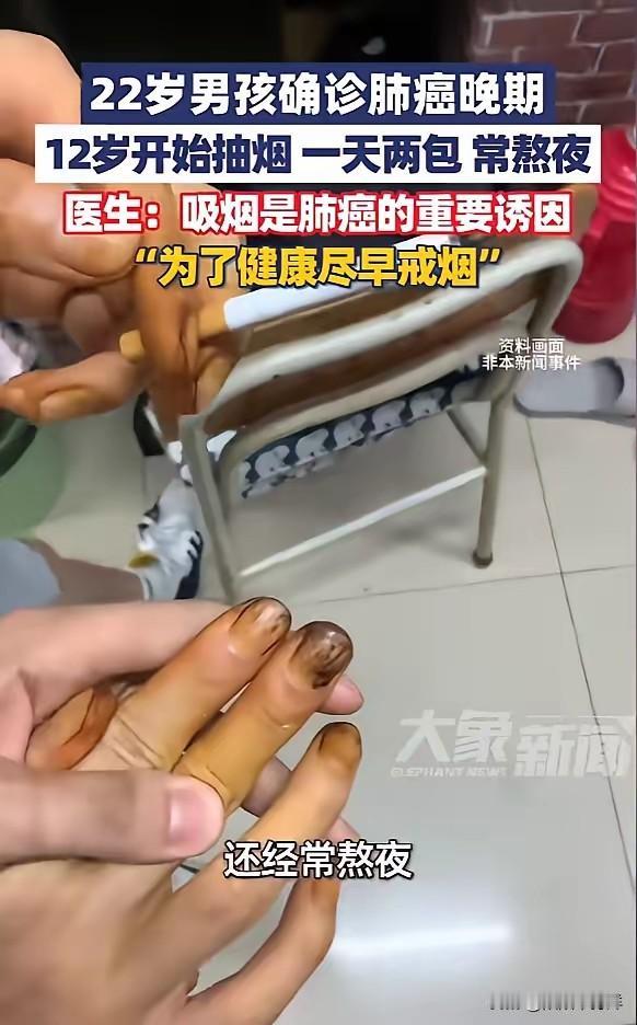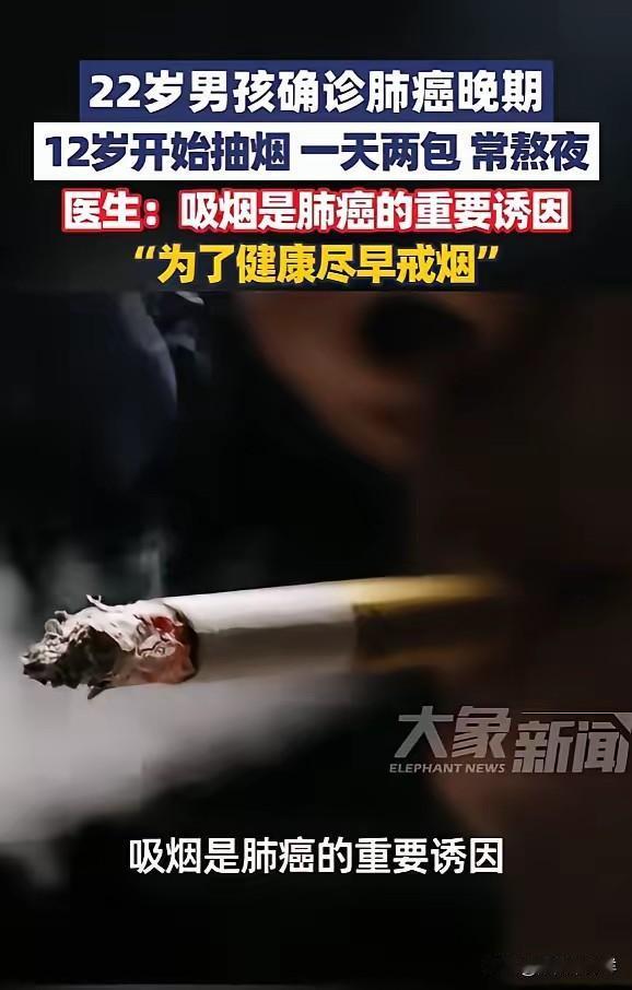 悲剧还是发生了!1月26日,河南郑州,一男子从12岁开始吸烟,每天都要抽两包,并且经常熬夜,结果最近老是咳嗽,有时甚至咳出血,稍微一动就喘不上气,去医院检查,竟确诊肺癌晚期!并且已经骨转移!网友:血的教训! 22岁确诊肺癌晚期,这个数字打破了很多人“癌症是老年病”的认知。12岁开始吸烟,一天两包,十年烟龄让他的肺部提前老化。医生明确指出,吸烟是肺癌首要诱因,这不是危言耸听。 有人说“身边老烟枪活了八九十岁”,这种幸存者偏差害了不少人。烟草中的焦油、尼古丁是明确致癌物,每吸一口都在损伤肺细胞。熬夜会进一步降低免疫力,双重伤害下,癌细胞的爆发只是时间问题。 骨转移意味着癌细胞已经扩散,患者后续将面临剧烈疼痛和治疗折磨。这不是个例,近年全国肿瘤登记数据显示,18-30岁肺癌患者占比逐年上升,吸烟和熬夜是主要关联因素。 未成年人吸烟问题亟待重视。12岁正是价值观形成期,缺乏对烟草危害的认知。家庭监管缺失、校园周边售烟管控不严,让不少孩子过早染上烟瘾。 当前国家已出台《未成年人保护法》严控向未成年人售烟,但执行仍有漏洞。需要学校、家庭、社会联动,加强青少年控烟教育,堵住烟草流向未成年人的渠道。 年轻人别拿健康赌未来。别等咳嗽带血才戒烟,别等呼吸困难才改变作息。身体没有试错机会,任何侥幸都是在拿生命冒险。 这起事件给所有人敲响警钟。控烟不是个人问题,是公共卫生议题。每个人都应主动远离烟草,同时监督身边人,尤其是未成年人接触烟草的行为。 各位读者你们怎么看?欢迎在评论区讨论。