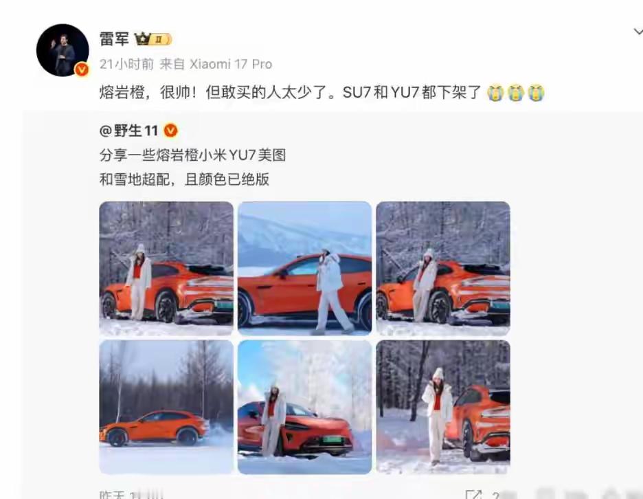 雷军表示熔岩橙好看,但是买的人实在太小了,小米SU7和小米U7这款颜色都下架了!