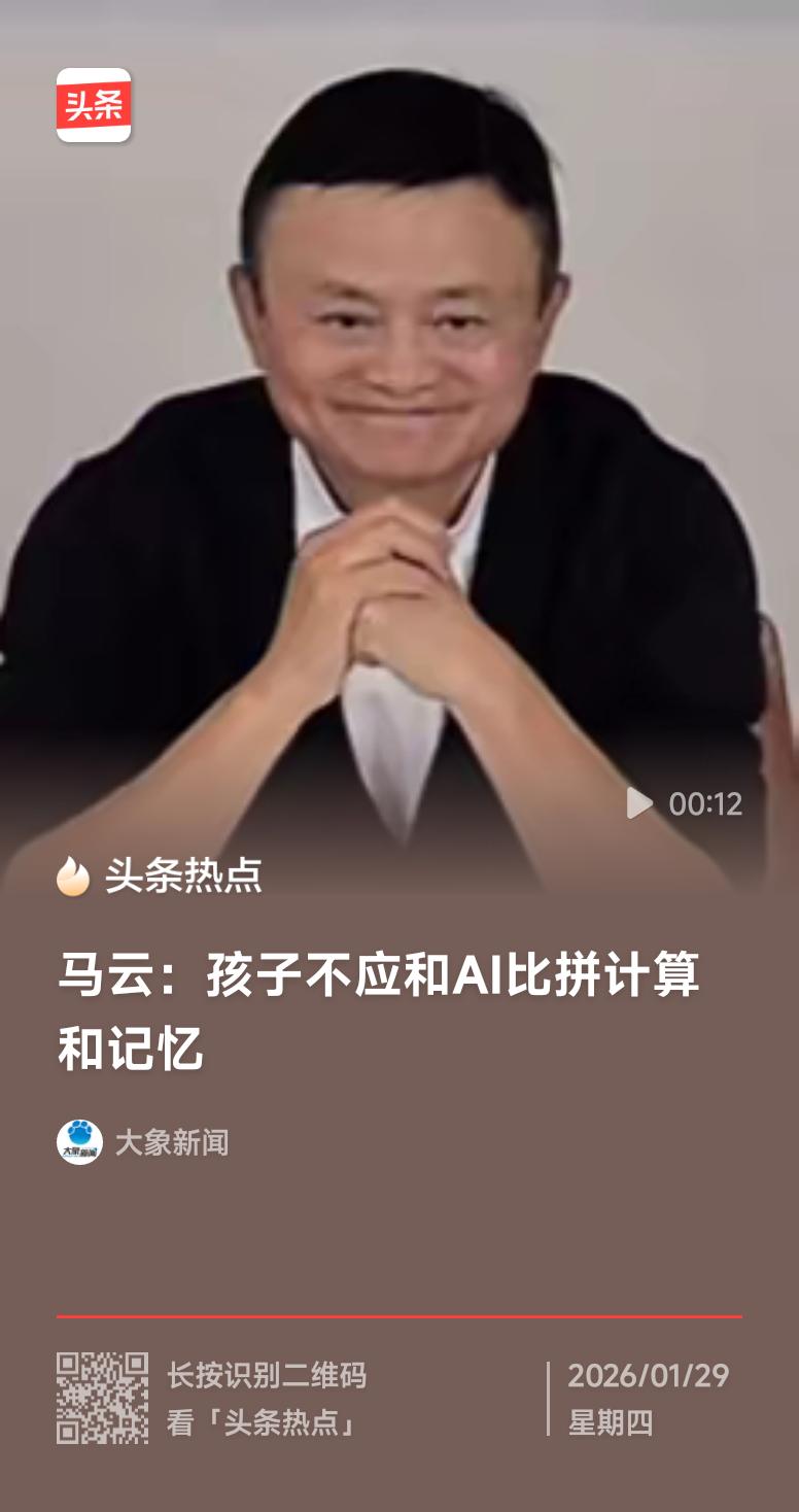 马云:孩子不应和AI比拼计算和记忆别再盲目逼孩子刷题死记硬背了!AI算力记忆远超人类,死磕这些只会被轻易取代。重点培养好奇心、思辨力与创造力,教会孩子用AI当工具借力,才是给未来留足底气!