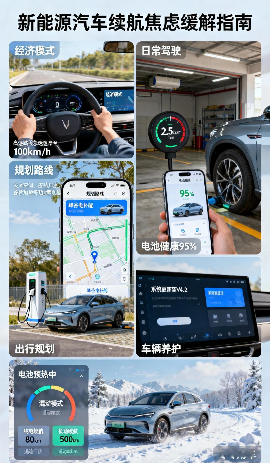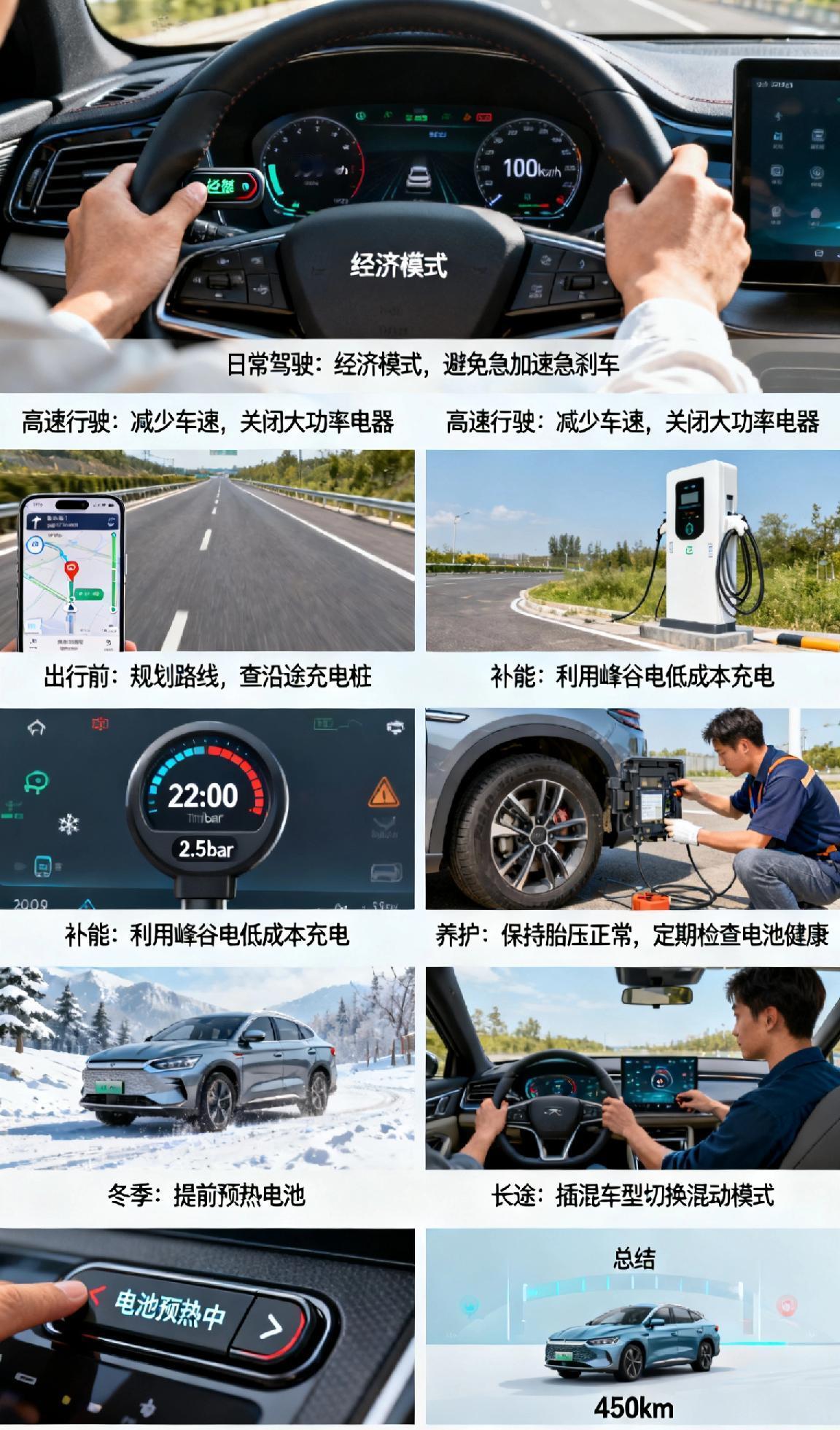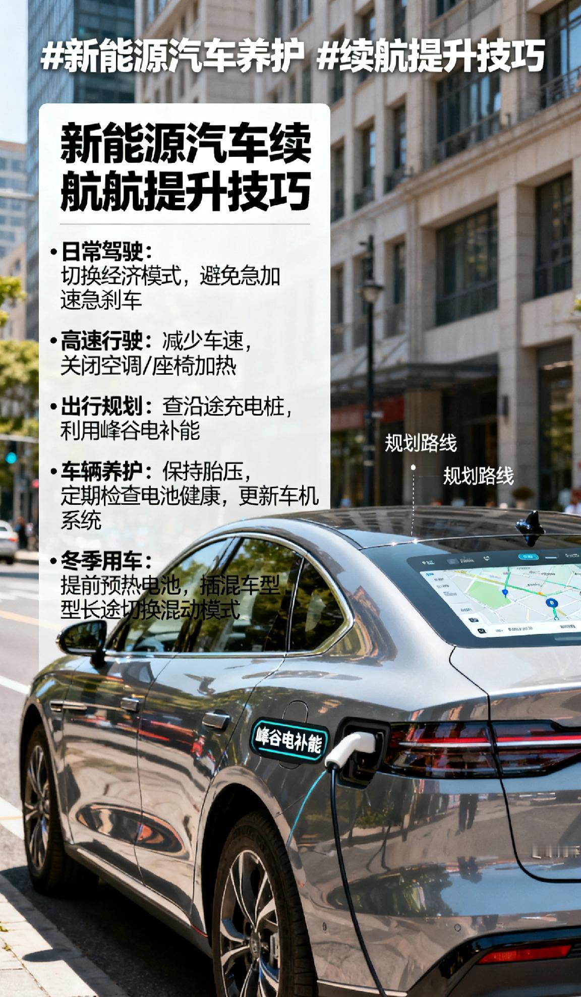 新能源汽车续航不够用怎么办?新能源汽车续航不够用,做好这几点能有效缓解焦虑。日常驾驶切换经济模式,避免急加速、急刹车,高速减少车速,关闭车内闲置的空调、座椅加热等大功率电器。出行前规划路线,提前查好沿途充电桩,利用峰谷电低成本补能。做好车辆养护,保持胎压正常,定期检查电池健康,及时更新车机系统。冬季用车提前预热电池,插混车型长途可切换混动模式。短途纯电通勤,长途合理补能,大幅提升续航利用率。 新能源汽车养护