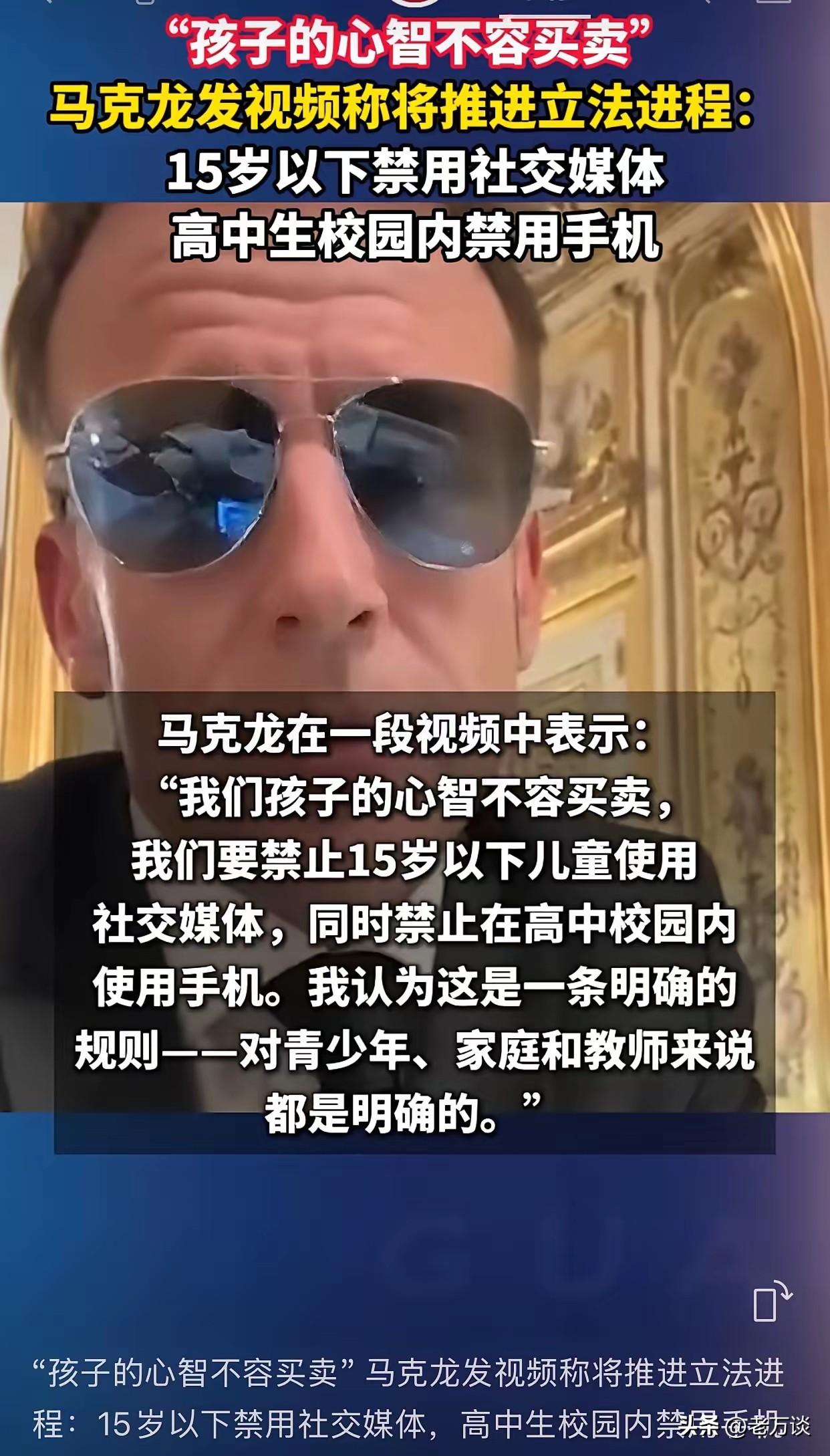 马克龙在媒体上宣称将通过立法禁止 15 岁以下的孩子使用社交媒体,高中生校园内禁用手机。如果马克龙能够通过这样的立法,对于法国来说真的是幸事,因为青少年是国家的未来,而现在的年轻一代很多沉迷于网络,沉迷于社交媒体,荒废了学习,荒废了人生的成长,这对于国家的长远发展是致命的。特别是有部分青少年沉迷于网络游戏,甚至使用社交媒体进行违法犯罪活动,因为青少年缺乏清晰的辨别能力和自控力。他们难以抵挡外界的诱惑,难以区分善恶美丑,所以进行立法限制少年人使用社交媒体是非常有必要的,如果这项提案能够获得国会通过,这将是一个大善法。