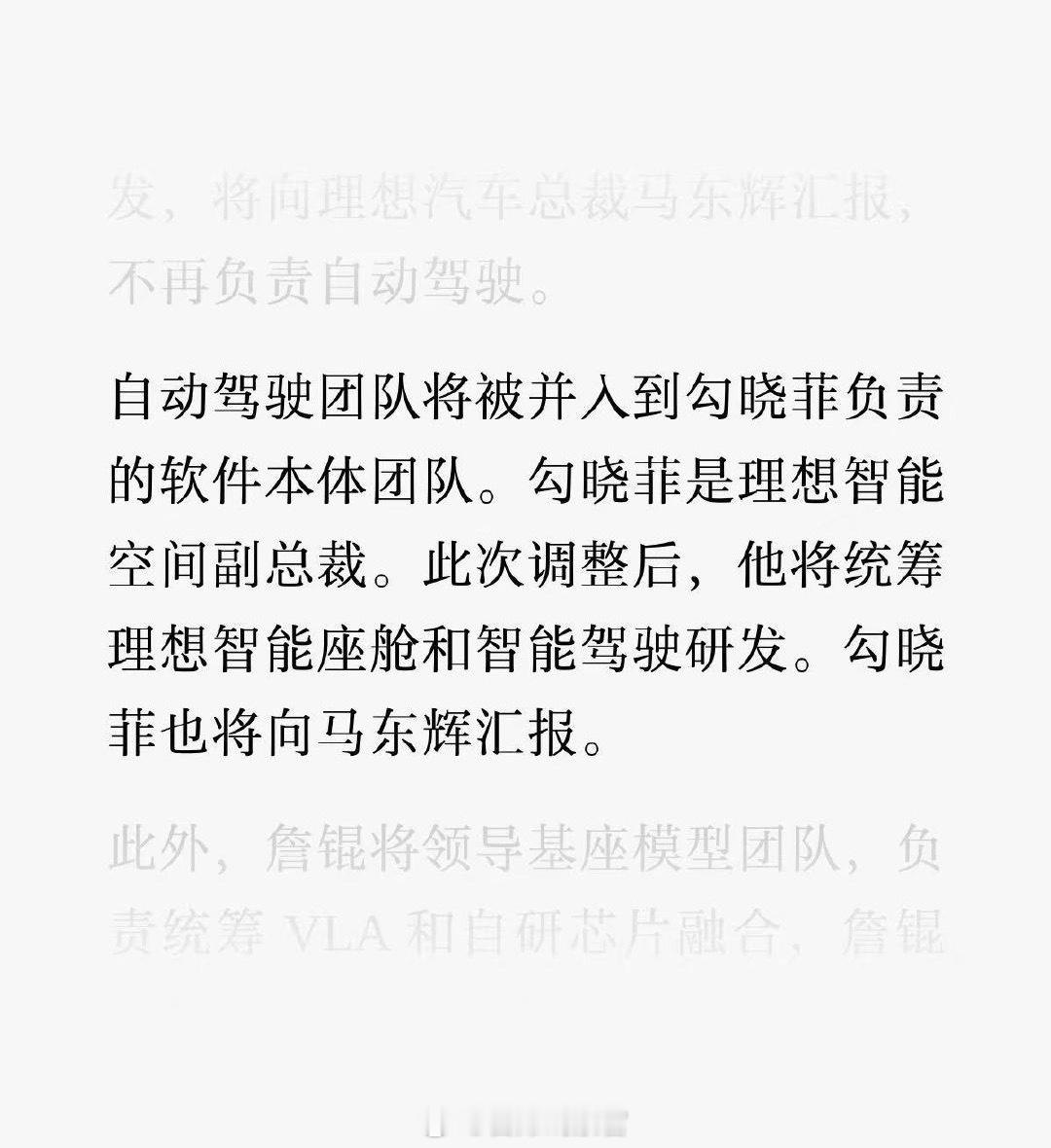 据新智驾消息,理想汽车将研发体系重组为三大团队:基座模型团队、软件本体团队、硬件本体团队,调整的重点是自动驾驶团队被拆分。此前自动驾驶高级副总裁郎咸朋将成为硬件本体负责人,主要负责机器人研发,将向理想汽车总裁马东辉汇报,不再负责自动驾驶。自动驾驶团队将被并入到勾晓菲负责的软件本体团队。勾晓菲是理想智能空间副总裁。此次调整后,他将统筹理想智能座舱和智能驾驶研发。勾晓菲也将向马东辉汇报。理想汽车308_IO新能源汽车