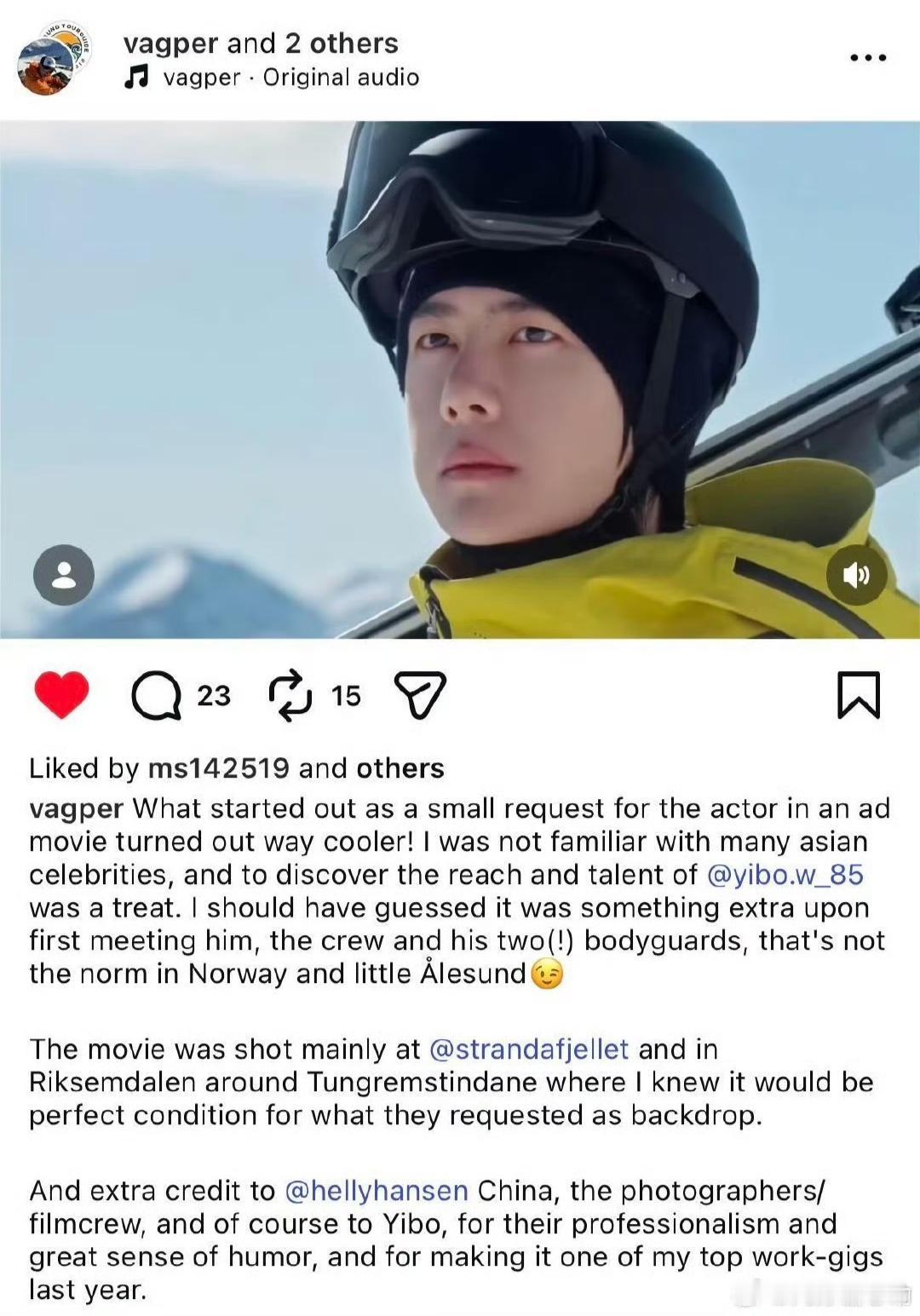 参与拍摄HH海丽汉森王一博广告大片的挪威合作团队发IG,惊叹王一博的影响力和才华! 王一博自带在哪里都能够用天赋才华征服人心的魅力,这一点已经被无数次的验证过。 译文:这原本只是广告片演员的一个小需求,没想到最后的结果超级酷!我们以前对亚洲明星不太熟悉,能发现王一博的影响力和才华真是一件乐事。 其实在第一次见到他、拍摄团队还有他的两位保镖时,我就该猜到他非同寻常了﹣﹣毕竟在挪威和奥勒松(Alesund)小镇,这种阵仗并不常见。特别感谢 HellyHansen中国、摄影与制作团队,当然还有王一博,感谢他们的专业精神和幽默感,让这成为我们去年最棒的工作经历之一。 王一博 实力派青年演员王一博