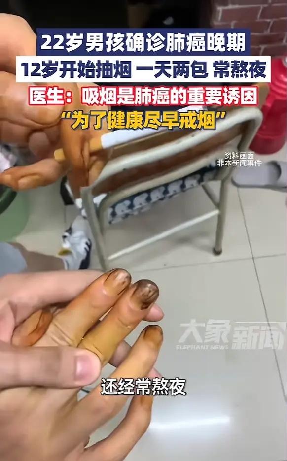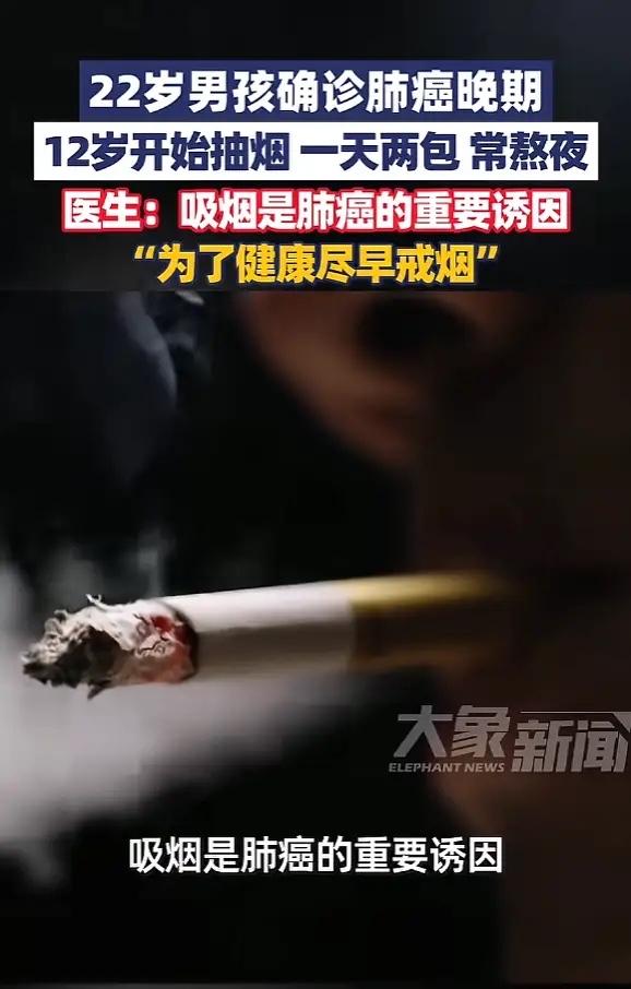 “悲剧还是发生了!”1月26日,河南郑州,一男子从12岁开始吸烟,每天都要抽两包,并且经常熬夜,结果最近老是咳嗽,有时甚至咳出血,稍微一动就喘不上气,去医院检查,竟确诊肺癌晚期!并且已经骨转移!网友:血的教训! 小伙子今年才22岁,吸烟史却长达十年。他从12岁就开始偷偷摸摸学抽烟,后来瘾越来越大,每天雷打不动两包烟。晚上打游戏、刷手机经常熬到两三点,生活节奏完全乱了套。 咳嗽带血丝,稍微走几步就喘不上气,这些信号他都没当回事。直到疼得受不了才去医院,检查结果肺癌晚期,癌细胞已经扩散到骨头里。 22岁就肺癌晚期,这在临床上非常少见。关键原因是他12岁开始吸烟,每天两包烟,长期熬夜,这些因素叠加在一起,把年轻的身体彻底拖垮了。 肺癌骨转移发生率在10%到15%之间,患者中位生存时间只有6到10个月。骨头疼痛、病理性骨折、脊髓压迫,这些并发症会让人生不如死。 开始吸烟的年龄越小,吸烟量越大,吸烟年限越长,肺癌的发病风险就越高。12岁开始吸烟,意味着他的肺部从发育期就开始承受烟草中毒素的持续伤害。睡眠不足会导致免疫力下降,身体修复机制受损。烟草中的致癌物和紊乱的生物钟联手,给癌细胞创造了绝佳的滋生环境。 现在他躺在医院里,要面对的是漫长而痛苦的治疗,肺癌骨转移的治疗以全身性综合治疗为主,包括化疗、靶向治疗、免疫治疗,配合局部放疗和止痛治疗。但晚期肺癌的五年生存率很低,IV期患者只有6.8%。 明明可以避免的悲剧,却因为年轻时的无知和放纵,让整个人生陷入绝望。吸烟不是成熟的标志,而是对生命的慢性谋杀。如果你已经开始吸烟,越早戒烟越好。戒烟后肺癌发病风险会逐年下降,戒烟时间越长,风险越低。 40岁以上、有吸烟史等高危人群,建议每年做一次低剂量螺旋CT筛查。十年烟瘾,换来的是晚期癌症和不确定的未来。健康没有后悔药,青春不该这样被挥霍。 各位读者你们怎么看?欢迎在评论区讨论。