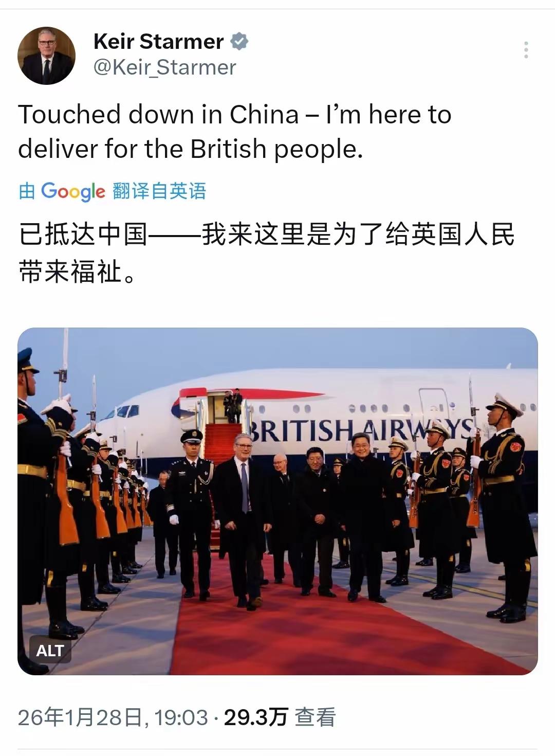 特朗普发现,自己起了个大早恐怕要赶个晚集啦。1月28日晚,抵达北京的英国首相斯塔默发文:“(我)已抵达中国——我来这里是为了给英国人民带来福祉。” 看来斯塔魔心情不错。这就对了嘛,还跟老美混什么?整天不是加税就是在加税的路上,鼻子眉毛一把抓,连英国这个当爹的也不放过。 一向政治嗅觉比较敏锐的英国这次虽然反应晚了点,不是第一个访问中国的国家,还好,也不是最后一个。你看,一到北京心情都好起来了,到北京来,解放区的天明朗的天……,还能给英国人民带回福祉,多好。 有开心的就会有糟心的,最糟心的恐怕是特朗普,100内就访问中国的承诺没兑现,好不容易预定了450天后的今年4月份访问中国,想吃个热乎的,结果发现,加拿大总理卡尼不宣先去了,谈的挺好,芬兰总统也去了,谈的也挺好,现在斯塔默又到了北京,估计也能谈的挺好,照这样下去,等到他四月份到北京还有两个月的时间里,整个欧洲不敢说,除了美国、日本,G7国家中的法国、德国和意大利可能早就在他之前到中国走一趟啦。 特朗普起个大早,不但热乎的没了,凉的也没有了。太郁闷啦!